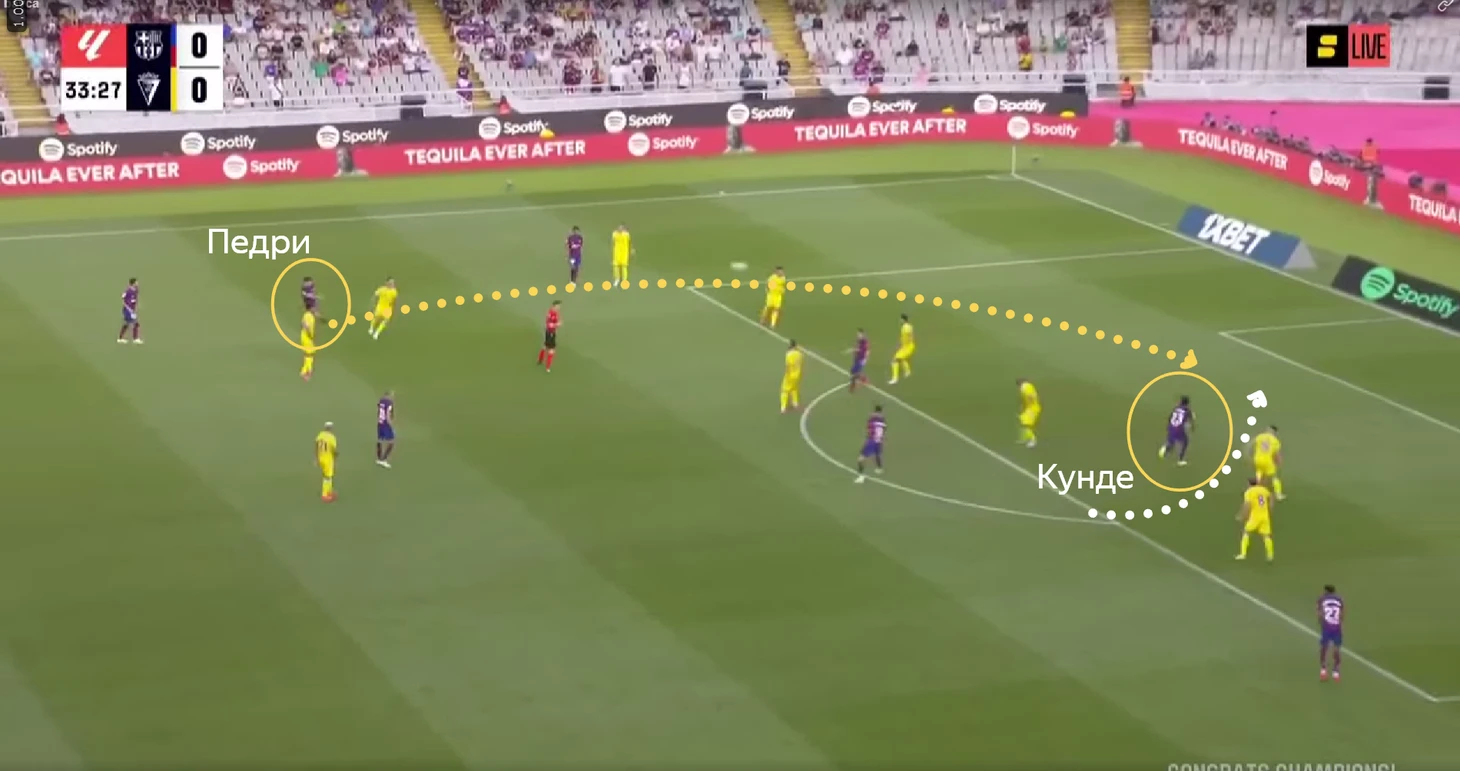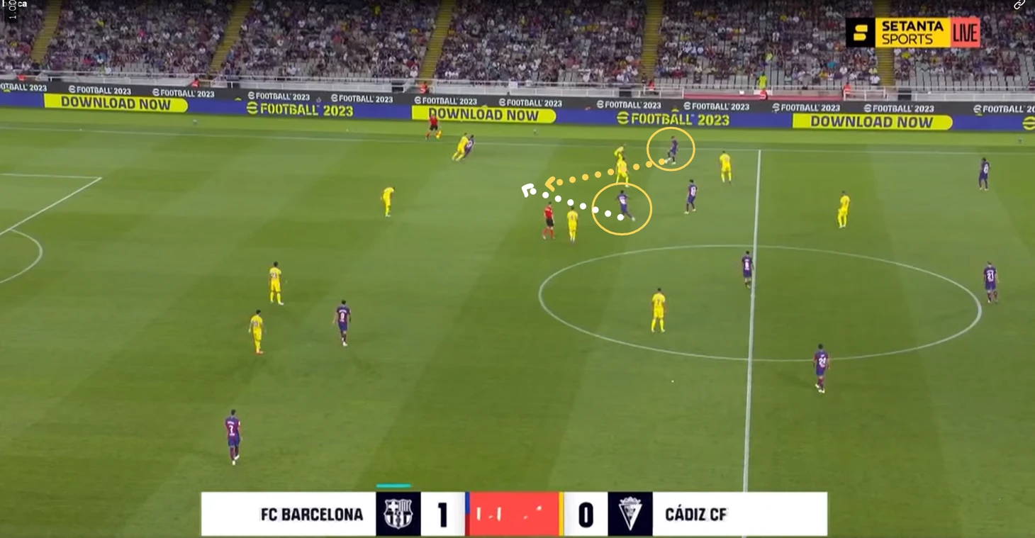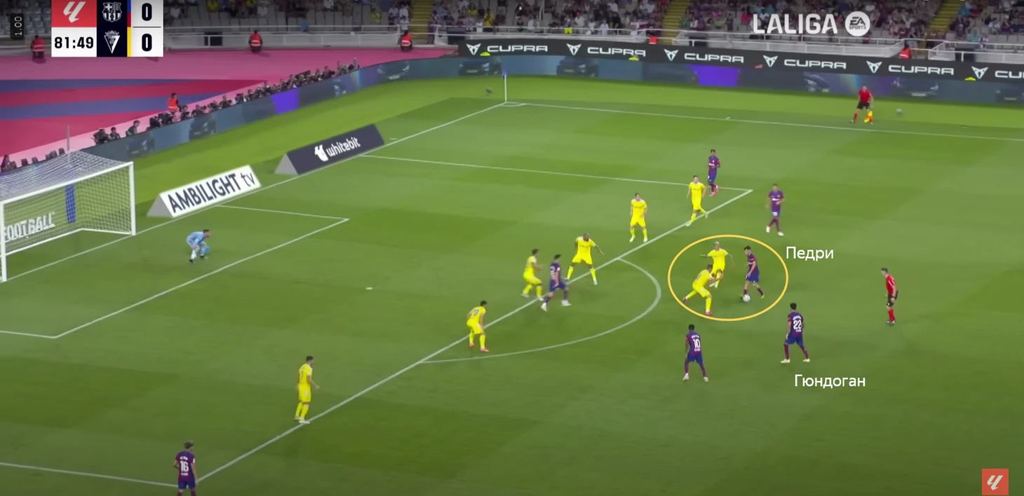 Педри с мячом направляется в сторону ворот диагональным движением справа в центр. «Кадис» не встречает агрессивно, защитники находятся в выжидательном режиме. Педри смотрит в сторону штрафной, не показывая намерения сыграть на Гюндогана, выжидает момента сближения с соперником и только тогда отдаёт мяч немцу.