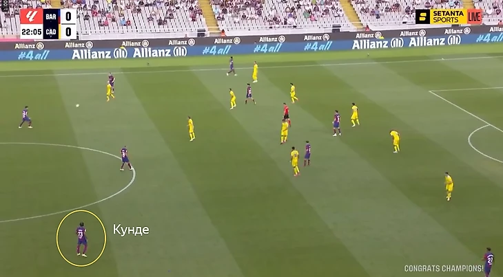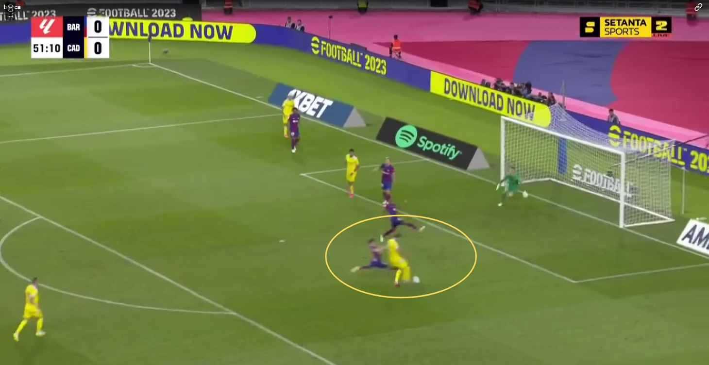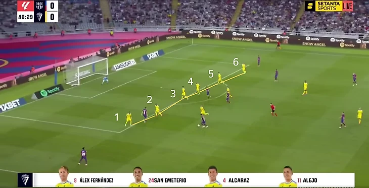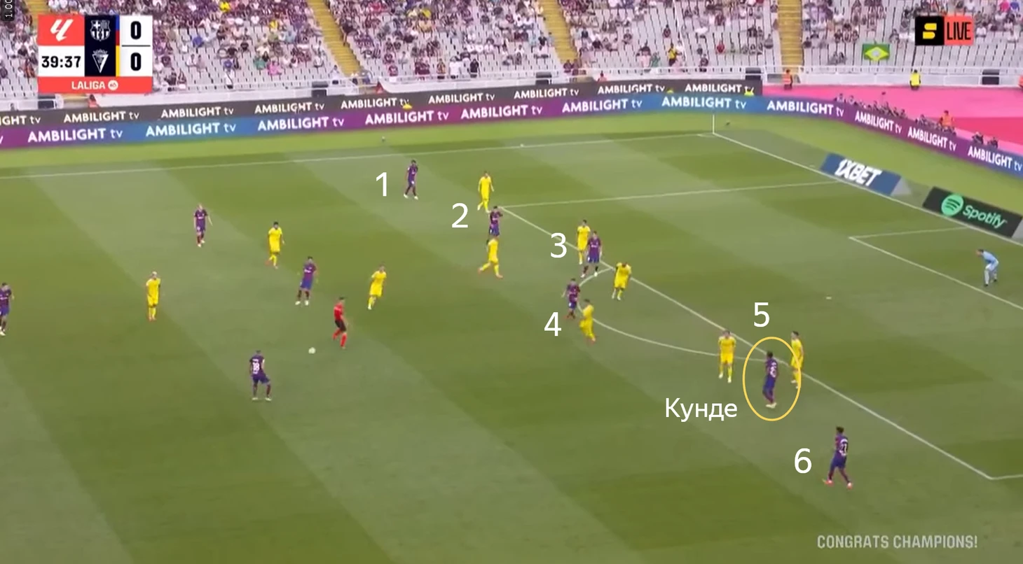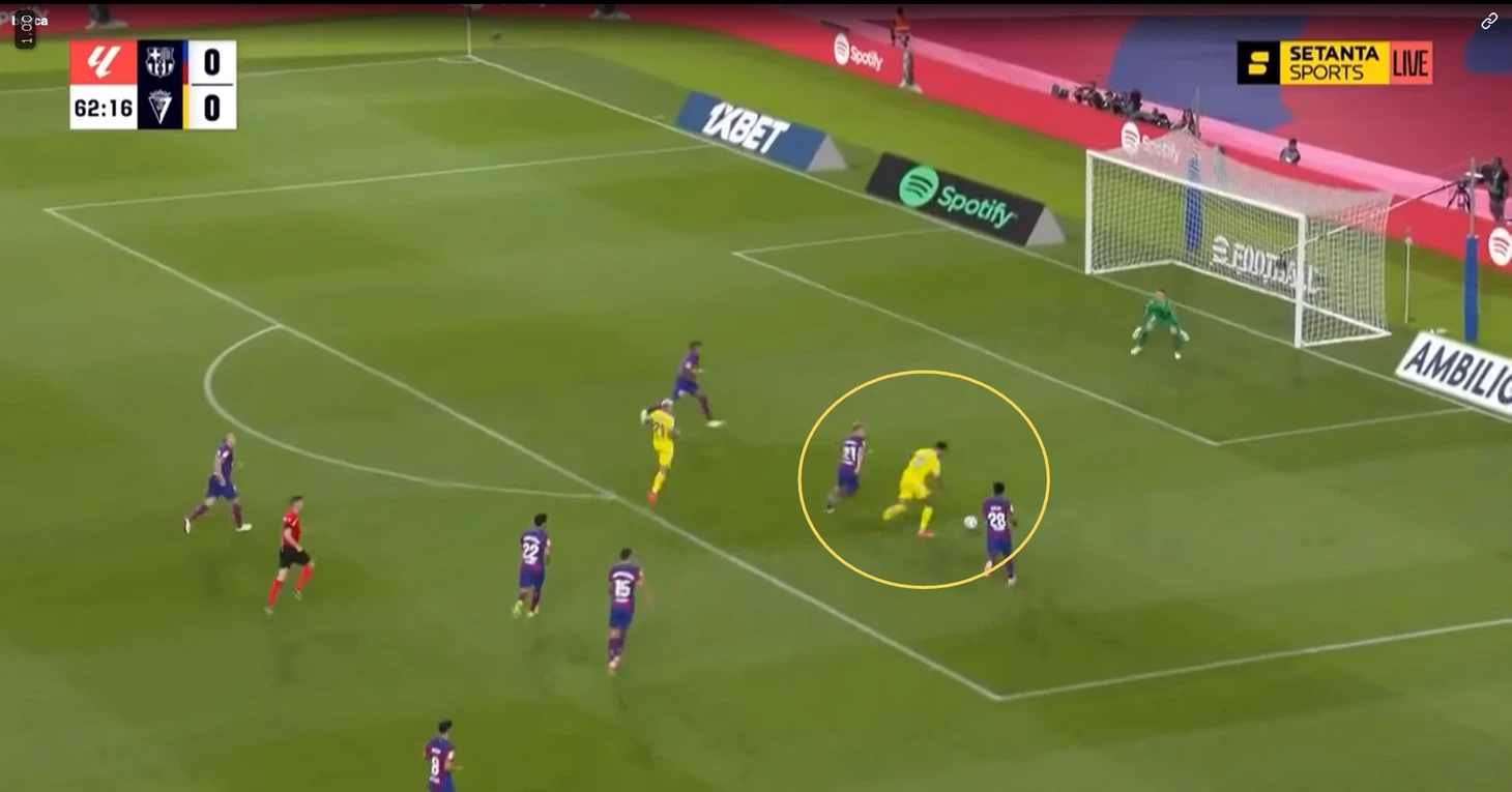 Педри с мячом направляется в сторону ворот диагональным движением справа в центр. «Кадис» не встречает агрессивно, защитники находятся в выжидательном режиме. Педри смотрит в сторону штрафной, не показывая намерения сыграть на Гюндогана, выжидает момента сближения с соперником и только тогда отдаёт мяч немцу.
