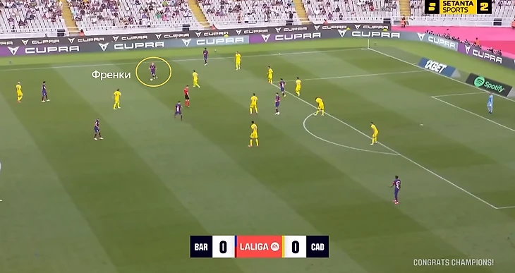 Одной из попыток обострений были забросы голландца за спины защитникам «Кадиса». Де Йонг принимал участие в начале атаки, протаскивал мяч и обострял передачами.