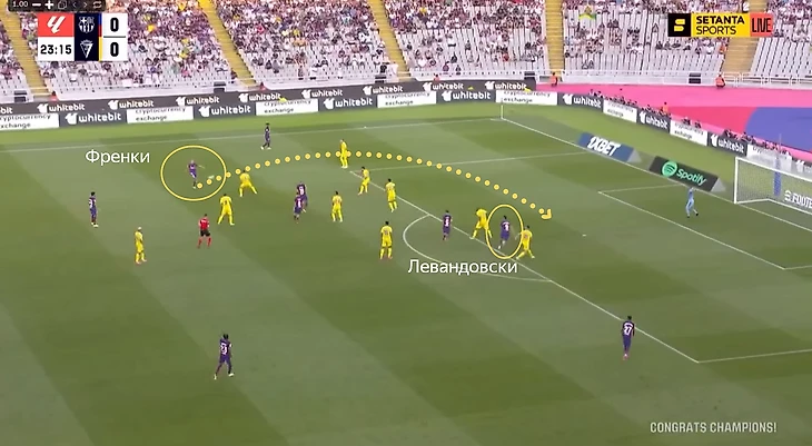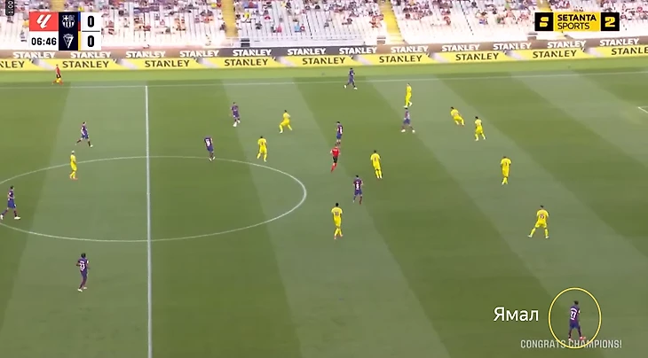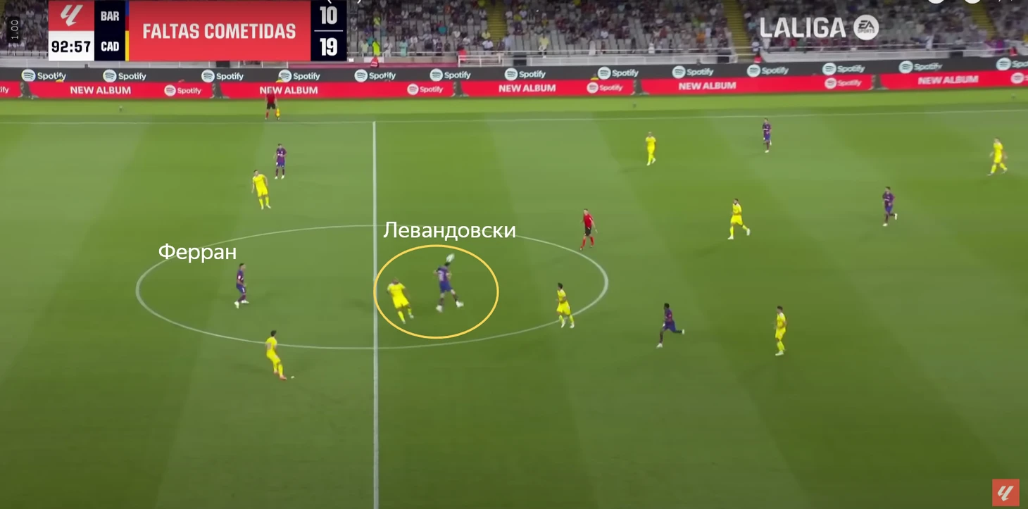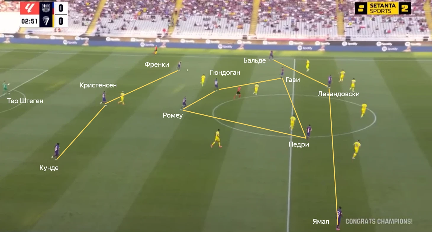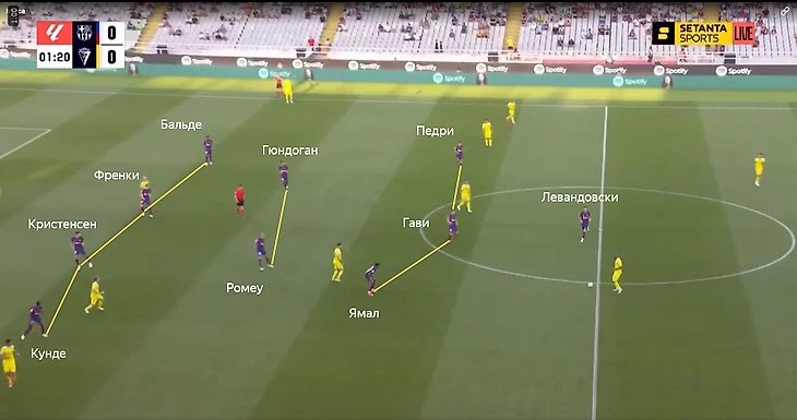 Каталонцы выстраивались по привычной структуре: тройка защитников сзади, пара в опорной, две восьмёрки, Бальде и Ямал создают ширину, Левандовски на острие.