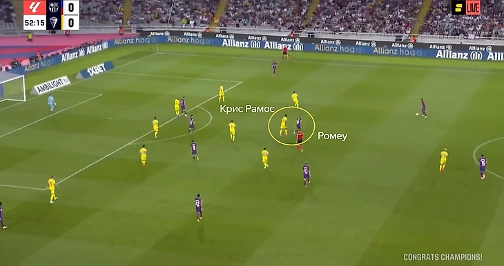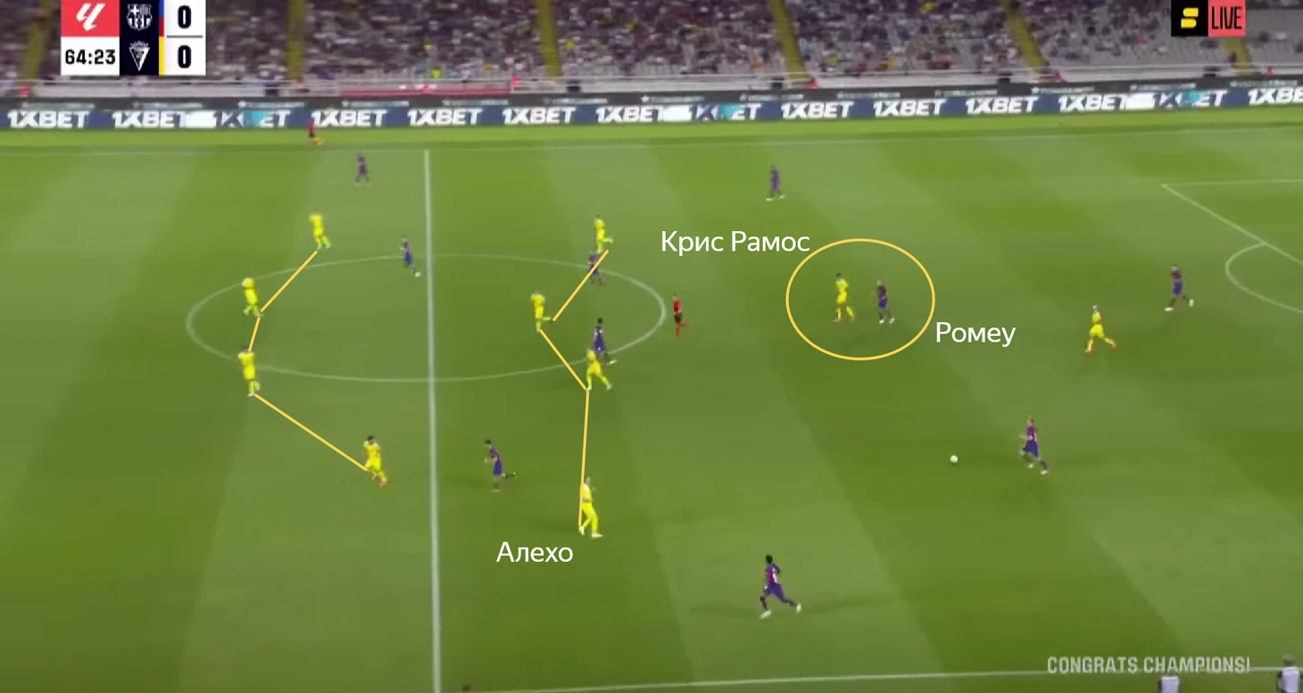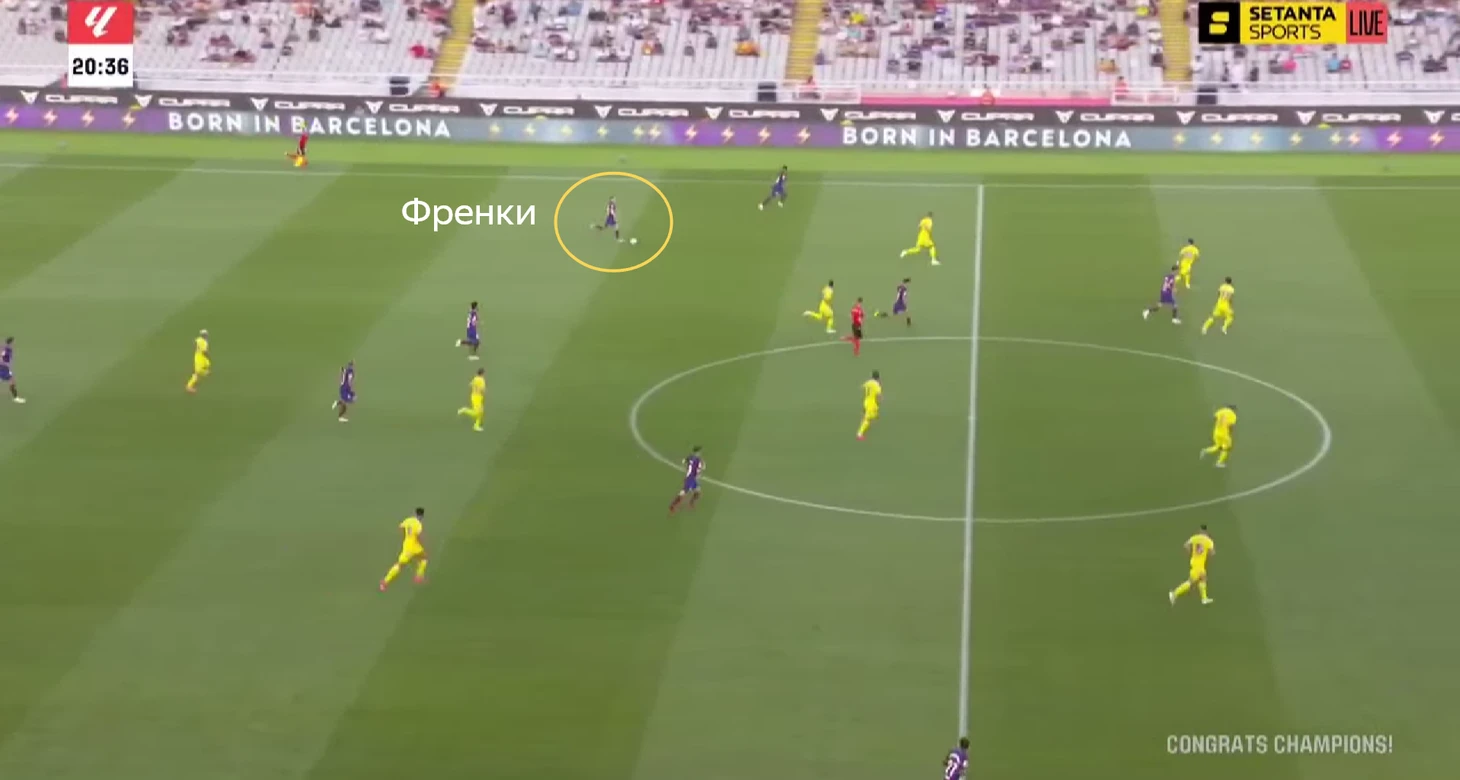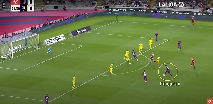 Без мяча (а это было редко) «Барса» действовала по схеме 4-2-3-1: Френки в классической роли центрального защитника, Гюндоган и Ромеу в опорной, Гави под нападающим, Педри слева.