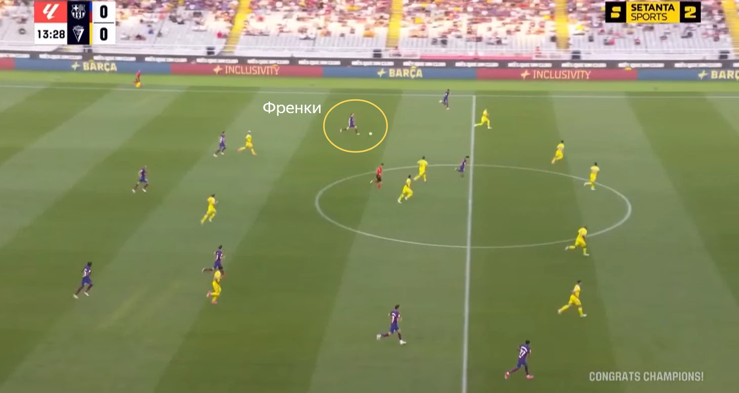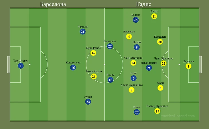 В матче против «Кадиса» в полуфлангах открывались Гави и Педри, а Гюндоган начинал ниже рядом с Ромеу, но постоянно шёл вперёд. Его место в таких эпизодах занимал Френки.