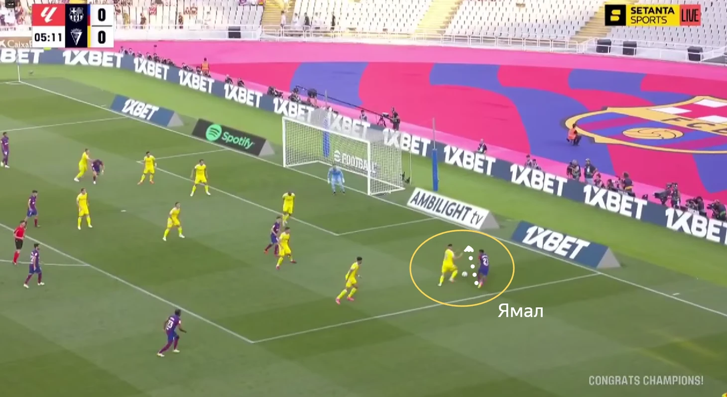 Команда создавала для него изоляции, а затем (не всегда, конечно) переводила мяч на правый фланг, чтобы использовать умение Ямала действовать 1-в-1.
