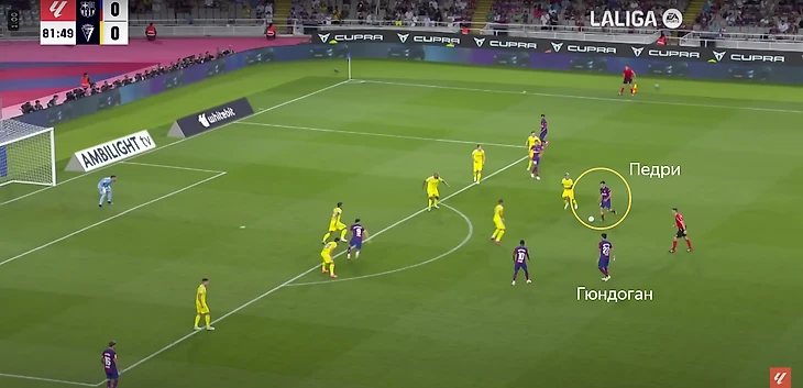Илкай получает свободное пространство и время на принятие решения. В момент, когда Гюндоган готов отдавать последний пас, Педри уже начинает рывок, но никто из защитников не способен успеть за испанцем: один не успевает (тот, который за спиной Педри), другой практически стоит на прямых ногах, третий явно начинает терять равновесие (корпус разворачивается в одну сторону, а взгляд направлен в другую).