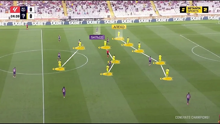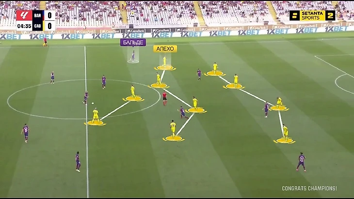 Начнём с «Кадиса». Оборонительный план гостей включал в себя гибридную схему с переходом с 4-4-2 на 5-3-2. Механизм простой – Иван Алехо опускался за Бальде (на практике почти всё время был в линии защиты):