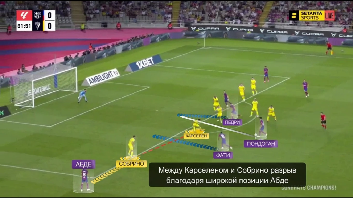 Ну а завершение вообще блеск. Во-первых, обратите внимание на разрыв между Карселеном и Собрино – он образовался из-за широкой позиции Абде и большому количеству игроков «Барсы» в опорной зоне, из-за чего «Кадис» снова стянулся в центр. Во-вторых, собственно, пас на Фати в образовавшийся коридор – очевидное решение для Гюндогана, но он сыграл тоньше и хитрее: внешней стороной стопы вырезал на вбегающего Педри. Почему хитрее? Да потому что у Карселена было больше шансов среагировать на рывок Фати, чем на Педри, который вообще был за спиной: