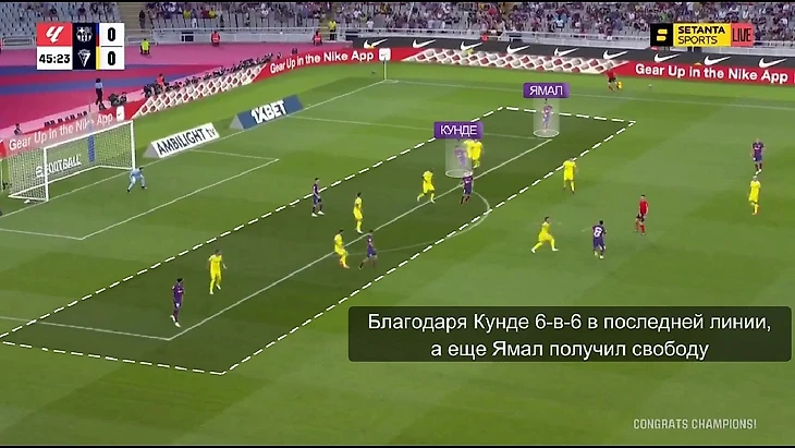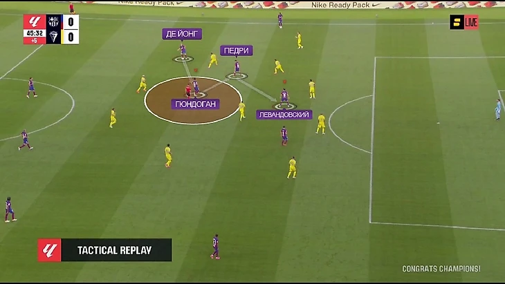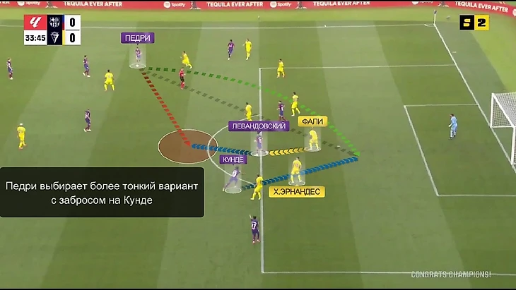 Одно из подключений Кунде почти привело к голу. Левандовский оттянулся назад под передачу Педри и увёл за собой Фали. Кунде, наоборот, вбегает в освободившуюся зону, а Хави Эрнандес словил ворон и вовремя не среагировал, из-за чего его команда чуть не пропустила: