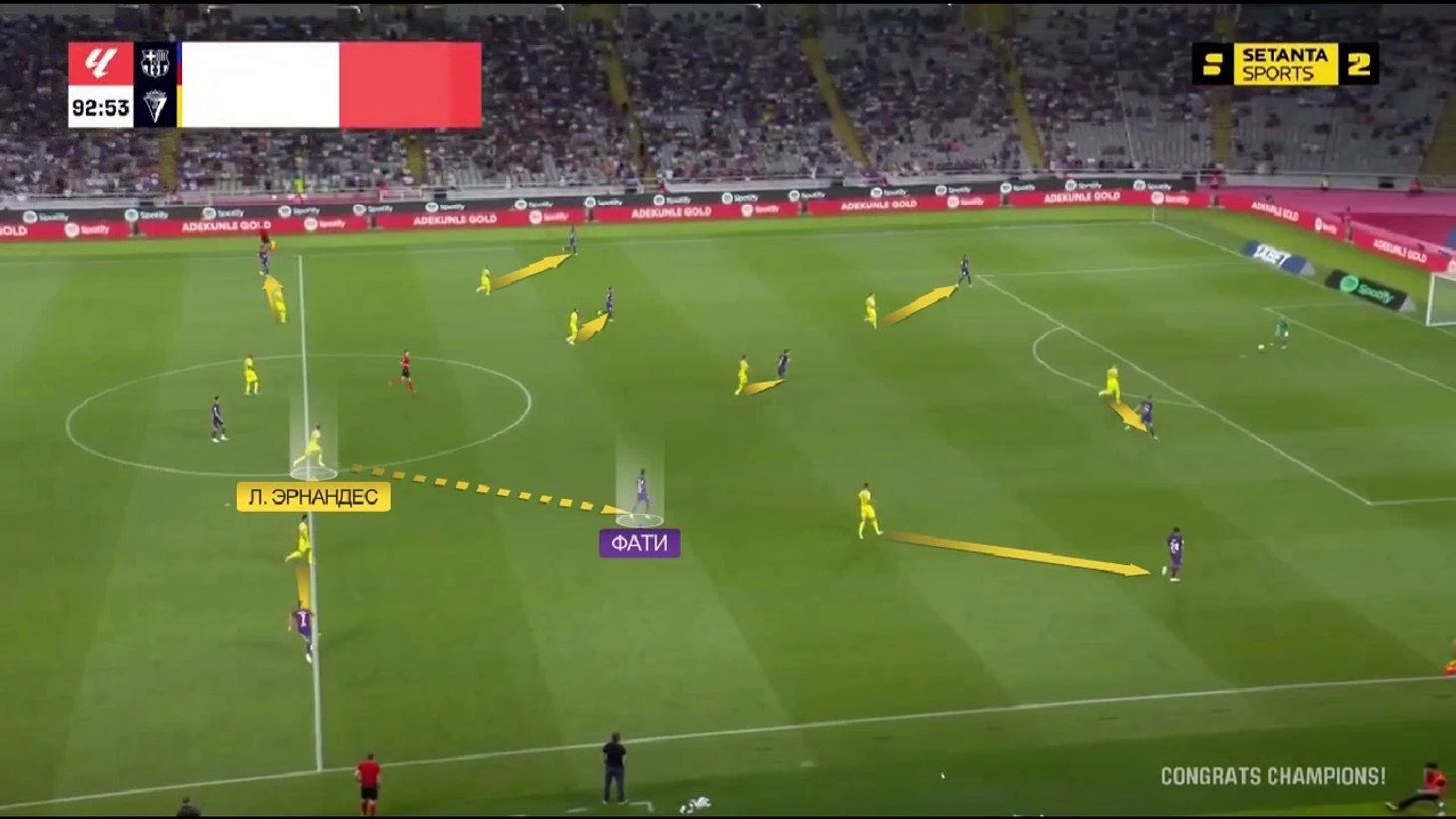 Гол Феррана Торреса не стоит рассматривать в контексте стартовых планов – понятно, что он пришёл уже когда «Кадис» уступал в счёте и рисковал. Началось всё с персонального прессинга в исполнении гостей – все разобраны кроме Фати, поэтому Луис Эрнандес срочно выбрасывается из линии, чтобы исправить такое положение вещей: