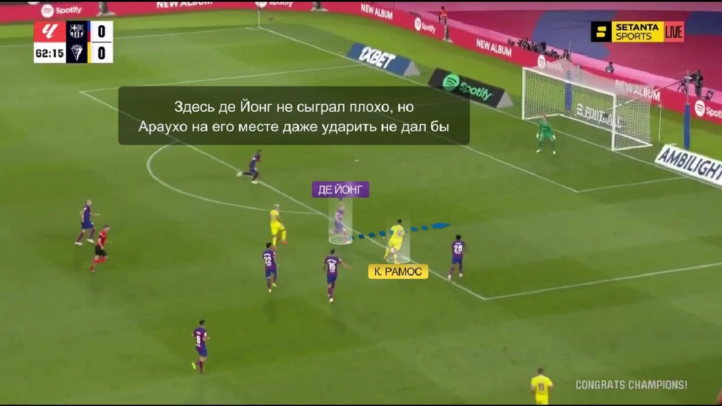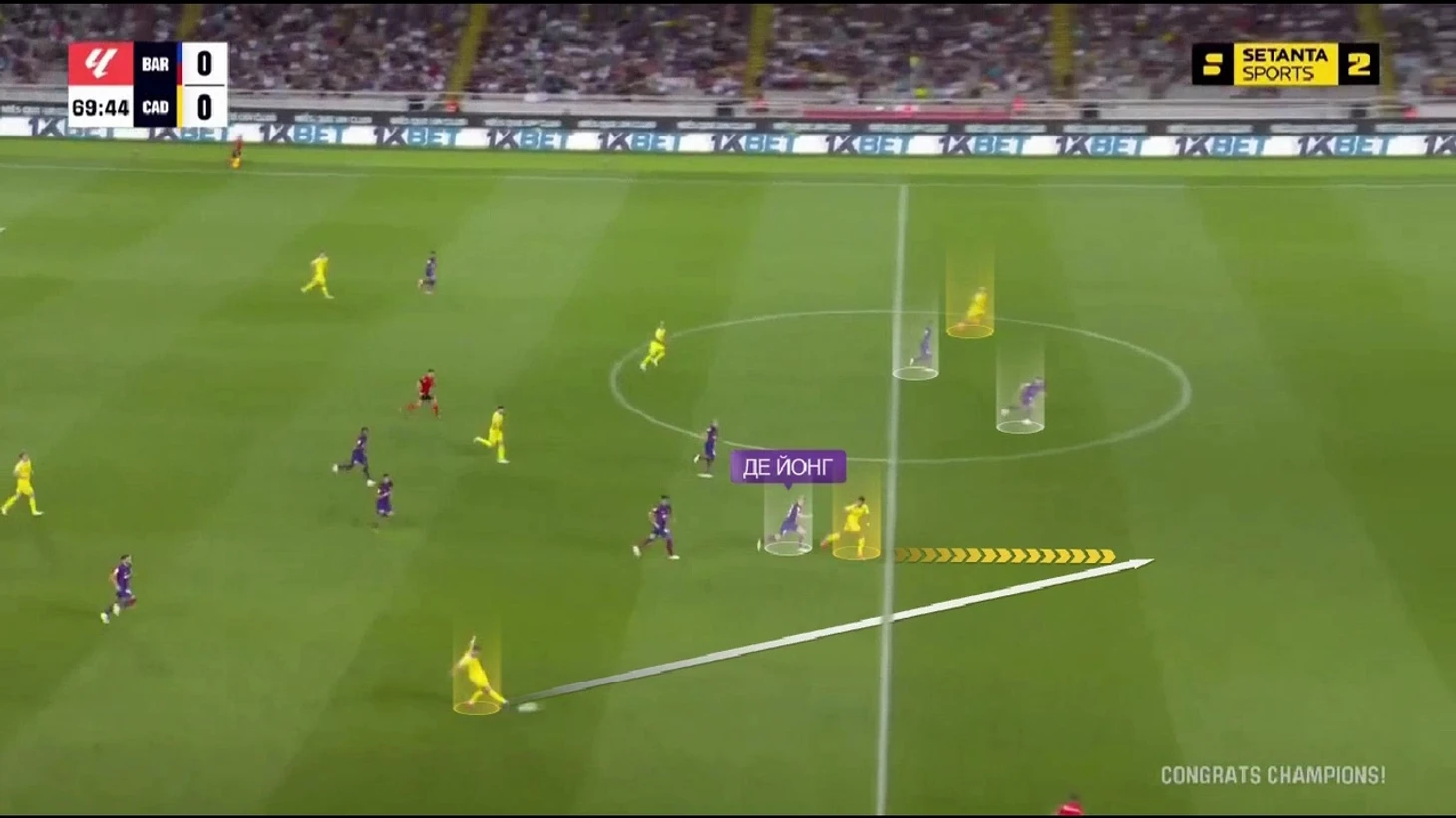 Само по себе наличие де Йонга в обороне – это, очевидно, минус один профильный защитник. В другой ситуации, даже если «Барса» пропускала редкую атаку, то можно было рассчитывать на скорость и мастерство каждого защитника. Но в матче с «Кадисом» в идентичных ситуациях уже было страшнее: