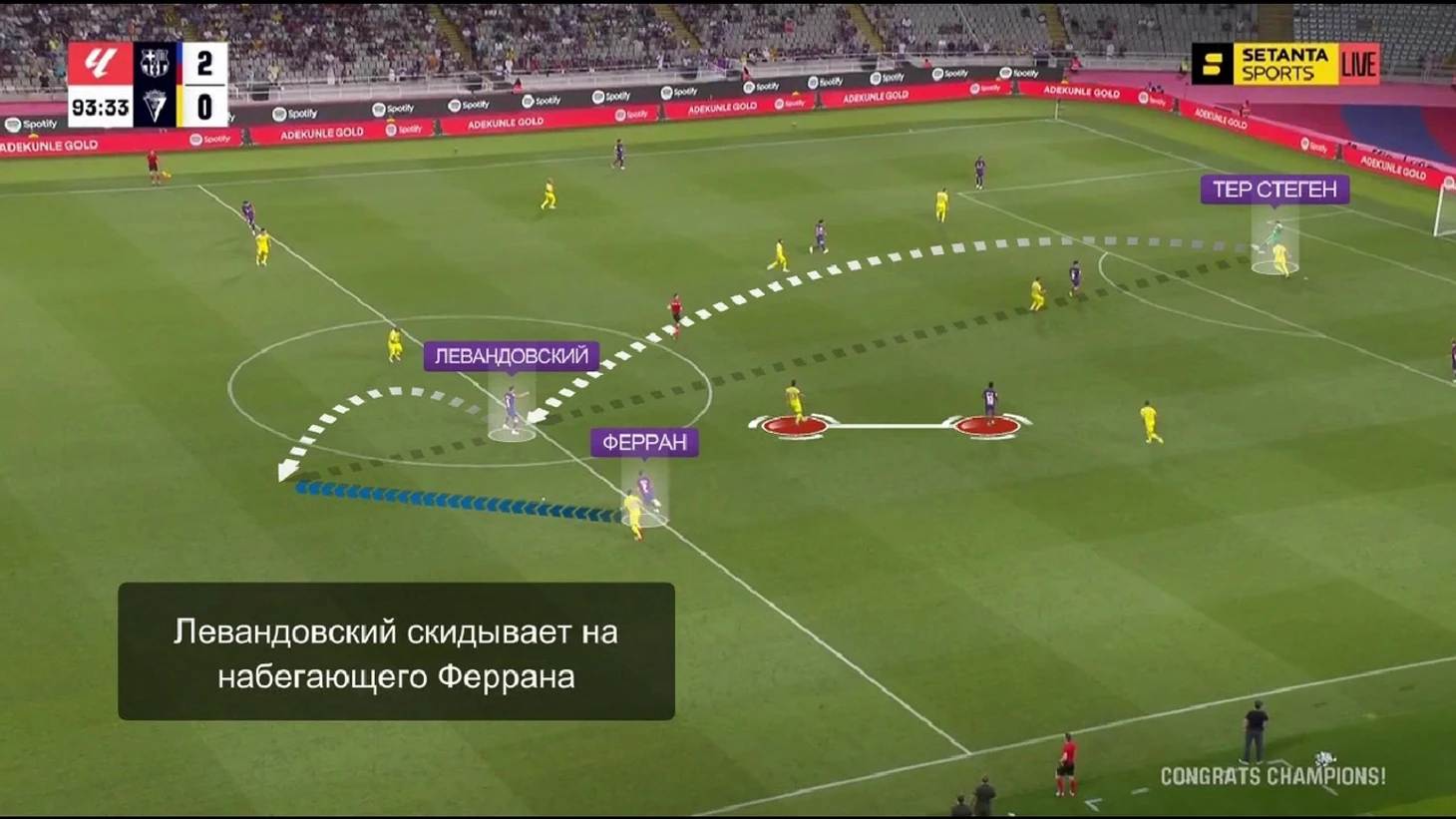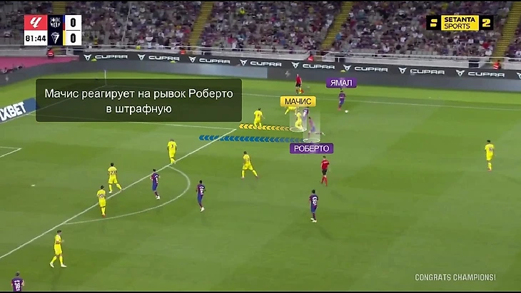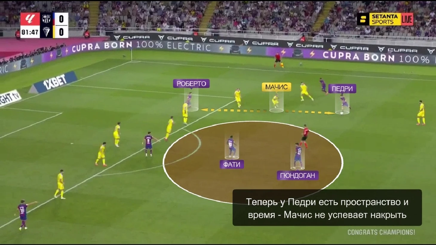 Гол Педри был забит уже после замен, ещё сильнее раскрывших игру, однако и в нём сказалось давление «Барсы» на опорную зону «Кадиса», а также классное движение игроков. Началось всё с рывка Роберто в штрафную. Он важен, потому что Мачис на него среагировал и потом не смог накрыть Педри – тот получил пространство и время, а также двух свободных партнёров перед штрафной:
