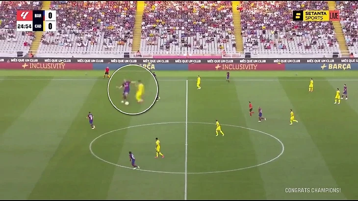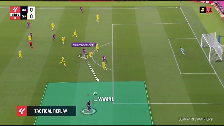 Но единственная проблема – мяч в этой зоне получил не Педри или Гави, а Роберт Левандовский. Весь «Кадис» уже стянулся в середину и Ямал имел кучу пространства в штрафной, но Роберт просто не смог нормально забросить: