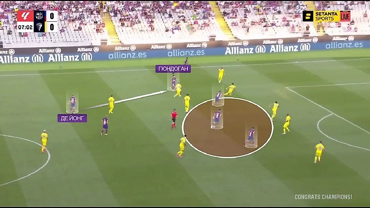 С другой стороны от Кристенсена было ещё интереснее. Френки де Йонга, стартующего в защите, мы много раз видели (даже в предыдущей встрече), но в этот раз был ещё и квадрат в центре поля: