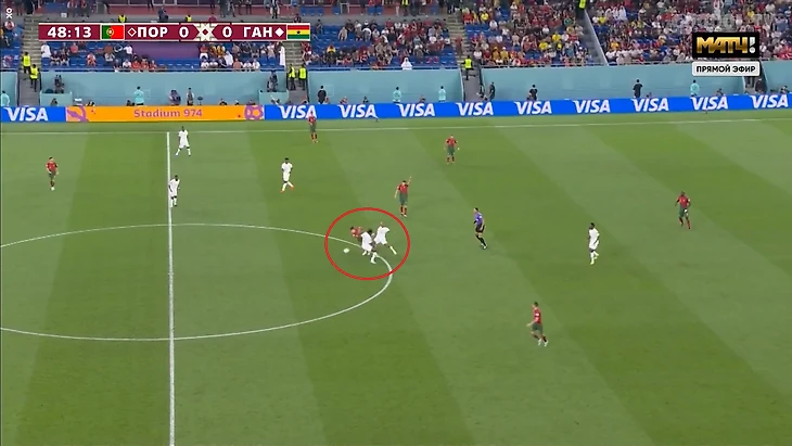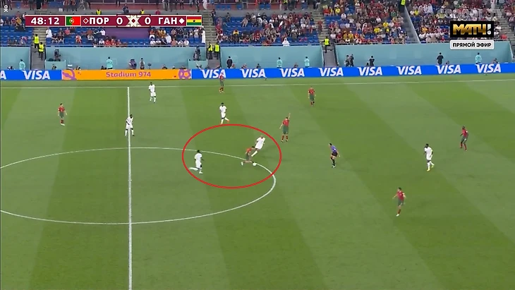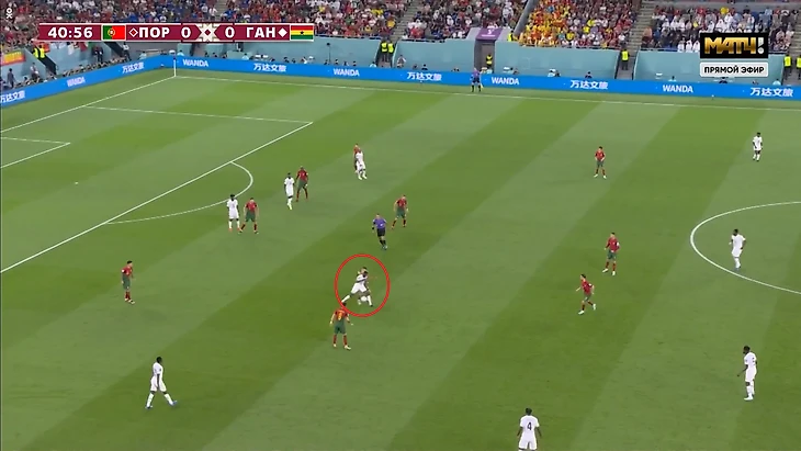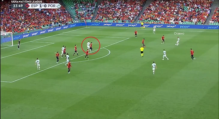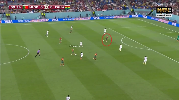 Обычно в прессинге Португалии участвуют 5 игроков. По опорному полузащитнику играет Силва, а Отавио включается, когда в билд-апе соперников задействованы 2 хавбека.
