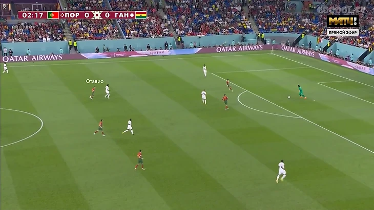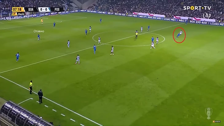 Еще один способ Отавио по развитию атак – забросы за спину. Зачастую адресатом таких передач оказывается Галено (самый быстрый игрок в составе «Порту»). Отавио выполняет заброс как только Галено начинает рывок, зная, что тот быстрее большинства оппонентов.