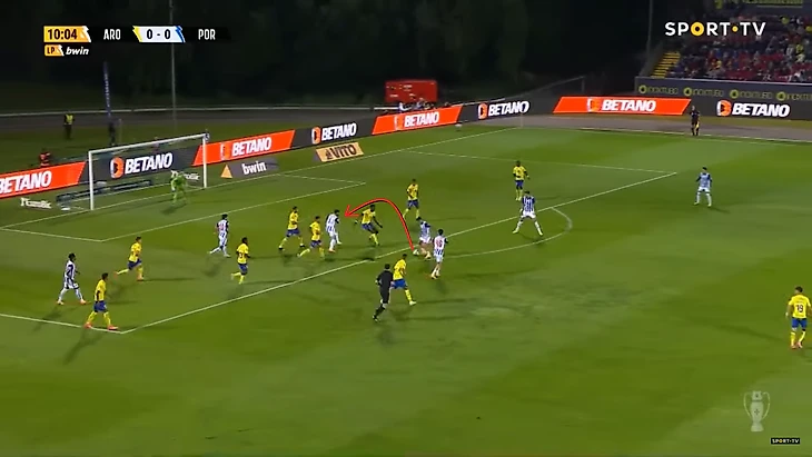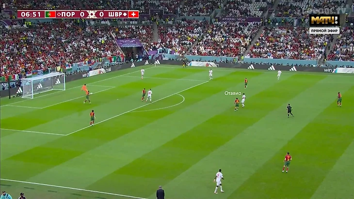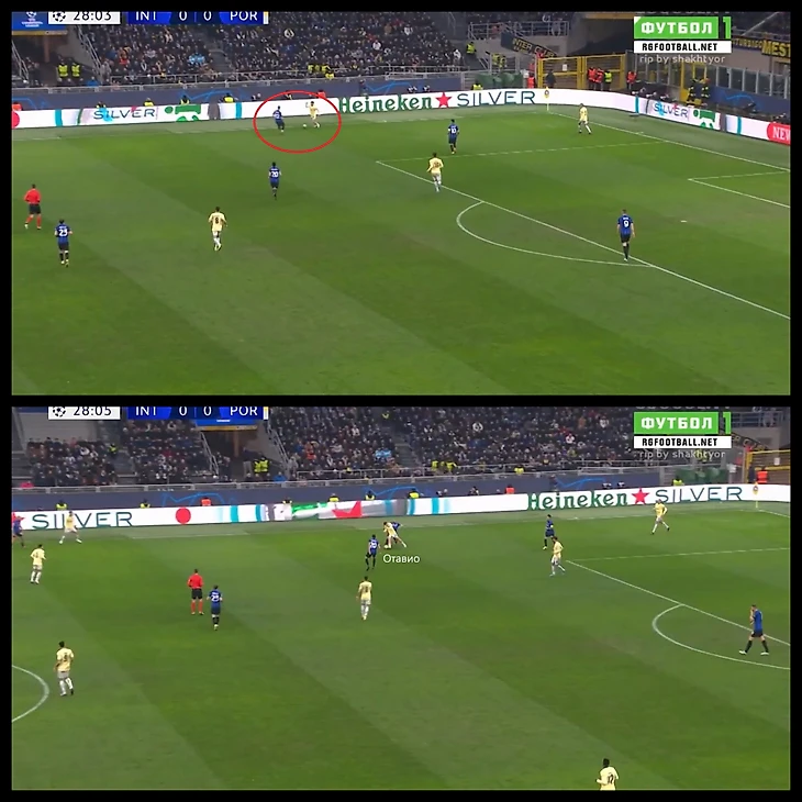 Отавио полезен в штрафной – своим движением он отвлекает внимание защитников, и освобождает пространство для нападающего. В эпизоде ниже своим рывком он сажает пару ЦЗ, тем самым создавая пространство для Роналду.