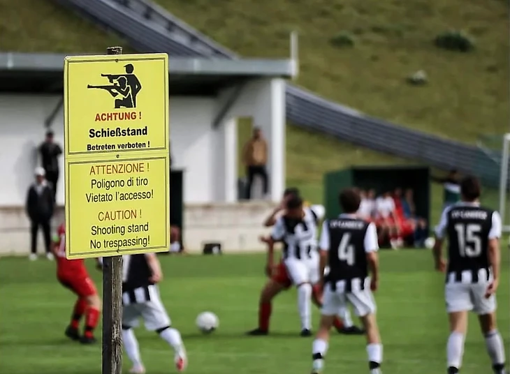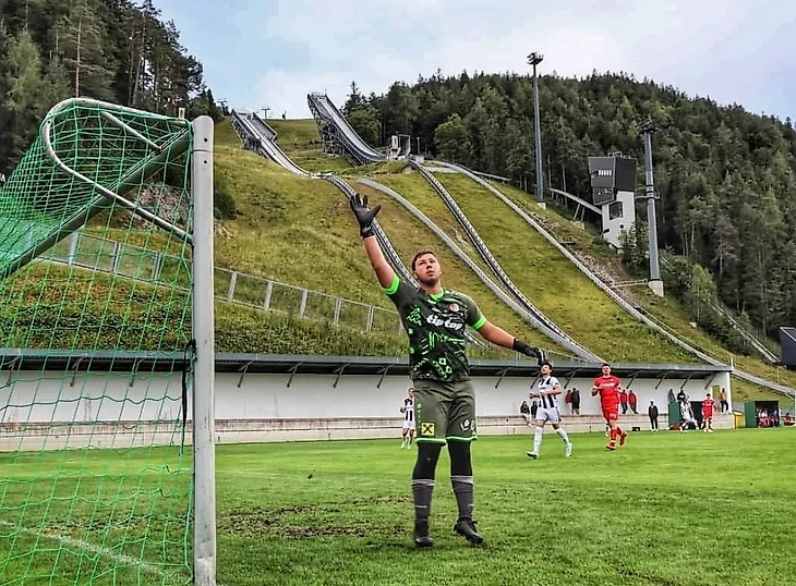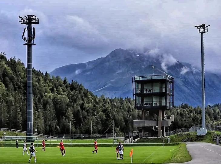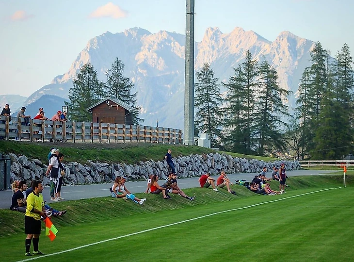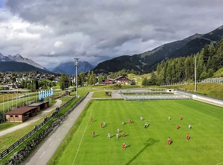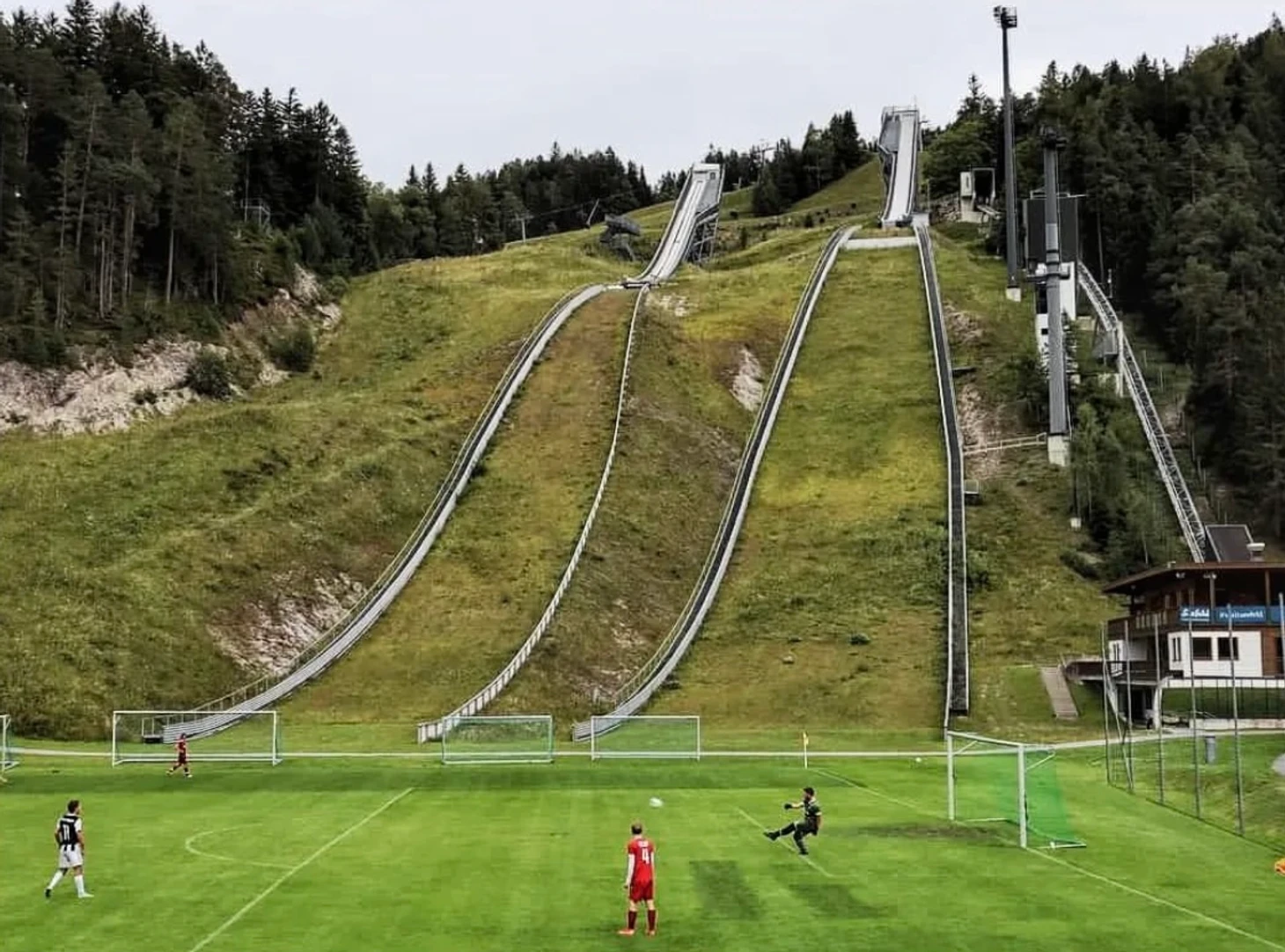 Прямо у подножия трассы для прыжков с трамплина находится поле ФК «Зеефельдер Плато».
