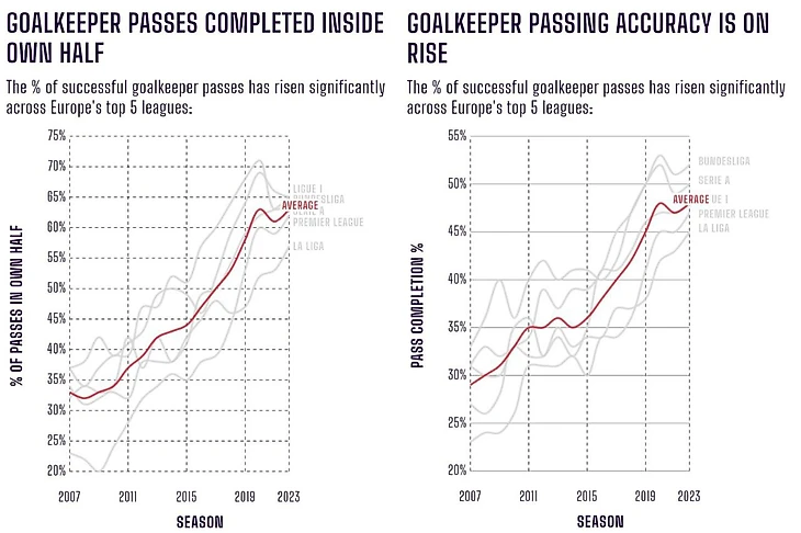 Начиная с сезона 2007/08 в каждой из топ-5 лиг Европы увеличилась средняя точность передач вратарей, средний процент передач вратарей от всех передач команды, а также точность этих передач. Голкиперы стали делать короткие передачи в два-три раза чаще, чем 16 лет назад.