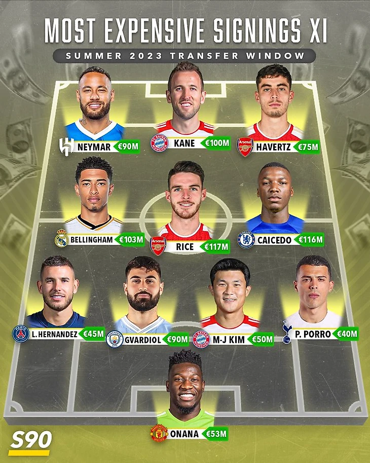 Короче говоря, клубы прилично потратились. А как бы выглядел состав из самых дорогих летних трансферов 2023 года? Этим вопросом задались эксперты Score90 и составили команду из футболистов, за которых командам пришлось выложить кругленькую сумма. Оцените: