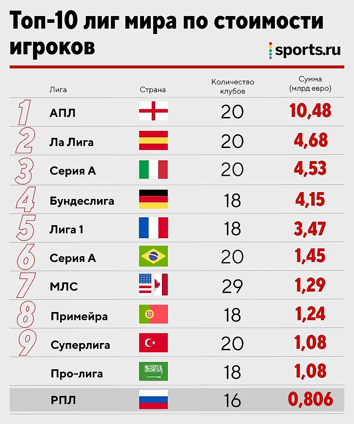 ● Лидерство АПЛ не удивляет, там даже два отдельных клуба («Манчестер Сити» – 1,24 млрд и «Арсенал» – 1,21) стоят больше, чем вся саудовская лига (1,02). Отрыв настолько велик, что две следующие лиги вместе взятые (Испания и Италия) отстают от АПЛ более чем на миллиард.