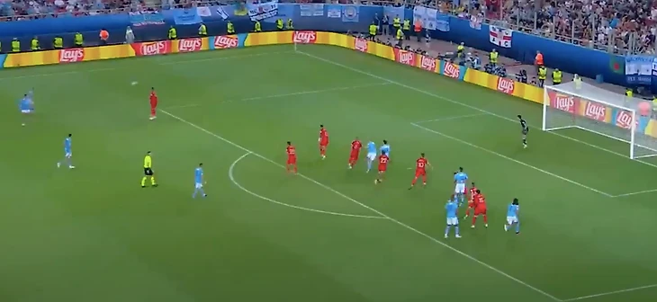 В том-же матче через несколько минут был точно такой-же момент. Подача из той-же точки за штрафной примерно в ту-же точку во вратарской