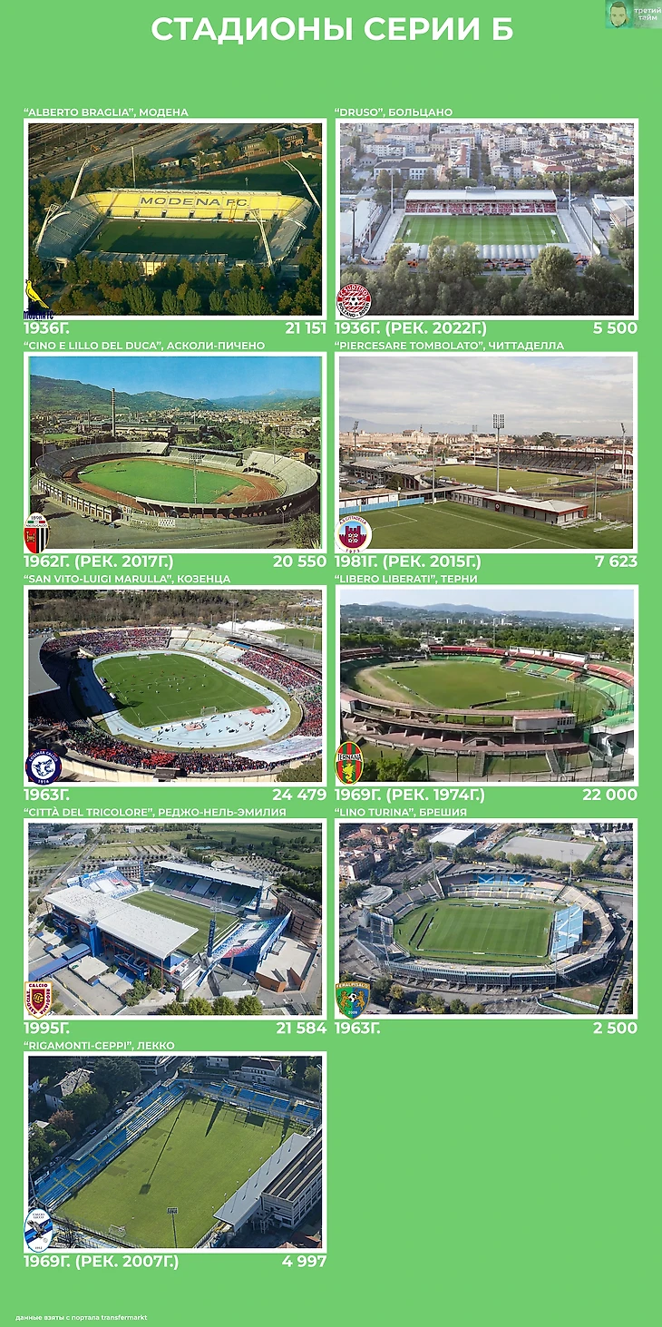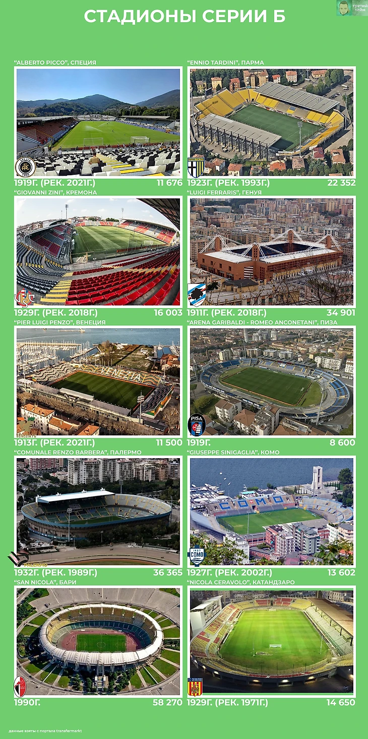 Но не все так плохо. У «Асколи», «Венеции», «Пармы» и «Пизы» в скором времени появятся новые стадионы. Кто знает, может быть и другие команды возьмутся за строительство и обновление своих арен. А у«Специи», «Палермо», «Модены» и «Кремонезе» весьма неплохие стадионы даже по меркам Серии А.