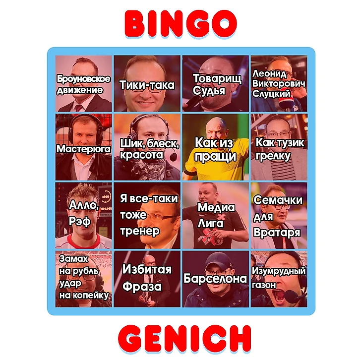 Если коллега Генич в матче между Спартаком и Ахматом соберет Бинго, то мы случайным образом разыграем 1 000 рублей среди комментарии под этим постом. Для победы необходимо, чтобы Генич озвучил 4 фразы, которые расположены по горизонтали, вертикали или диагонали.
