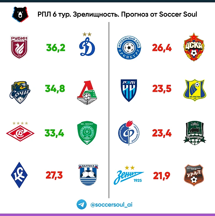 Прогноз зрелищности РПЛ от нейросети, 6 тур