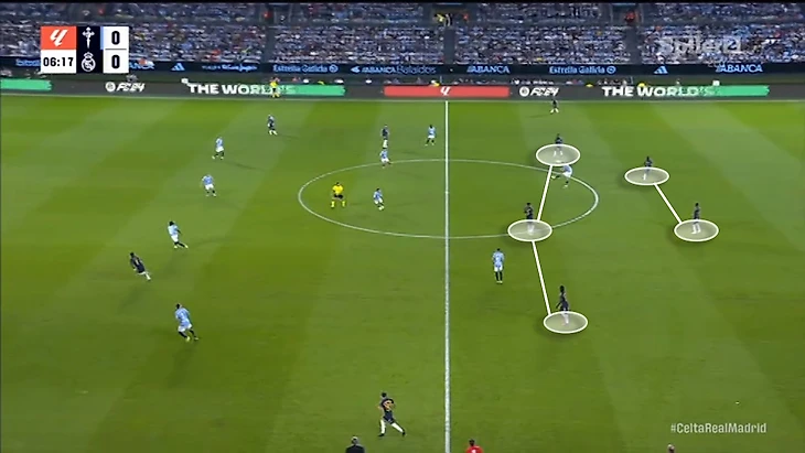 ● «Реал» разыгрывал мяч в начальной стадии по схеме 2+3, где ключевым игроком для преодоления давления соперника становился Феде Вальверде. Команда пыталась выводить мяч вперед преимущественно через уругвайца и это наводит на мысль, что Анчелотти все еще не полностью доверяет паре Тчуамени-Камавинга в вопросе билдапа. В текстах к прошлым матчам мы уже обсуждали, что французская пара «Мадрида» пока не научилась контролировать темп игры и поэтому вывод мяча вперед через рывки Феде сейчас выглядит более предпочтительным вариантом. Скорее всего, это временно, поскольку Орельен и Эдуардо будут добавлять в вопросе принятия решений и чувства темпа.