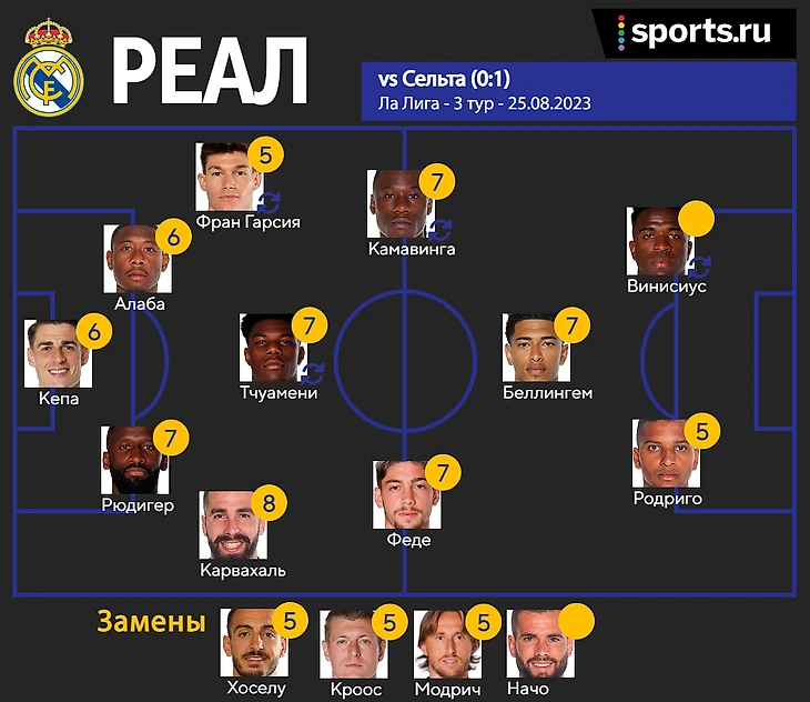 Родриго Гоэс — 5. Не лучший матч Родриго, но и провальным его не назвать. Оценка ниже 6 связана с решением игрока пробить пенальти самому, даже когда тренер сказал, что бить должен Модрич (Карло подтвердил это на пресс-конференции после игры). Смелость и решительность нужно поощрять, но здесь было четкое указание тренера и в итоге Родриго не забил. В остальном, бразилец был активен и несколько раз прорывал оборону «Сельты» благодаря дриблингу. Добавлю еще немного по поводу пенальти: и Вини, и Родриго должны продолжать подходить к точке, так как только через постоянное обучение можно становиться лучше. Не разделяю мнения, что из-за промаха кого-то из них надо лишить их возможности бить пенальти. Это деструктивный подход, который применим только к ментально слабым игрокам, не способным преодолевать трудности. Надо набивать шишки (но только не тогда, когда тренер дает тебе прямое указание, чтобы ты не бил, безусловно). Игроки растут не только через успехи, но и через неудачи, делая работу над своими ошибками.