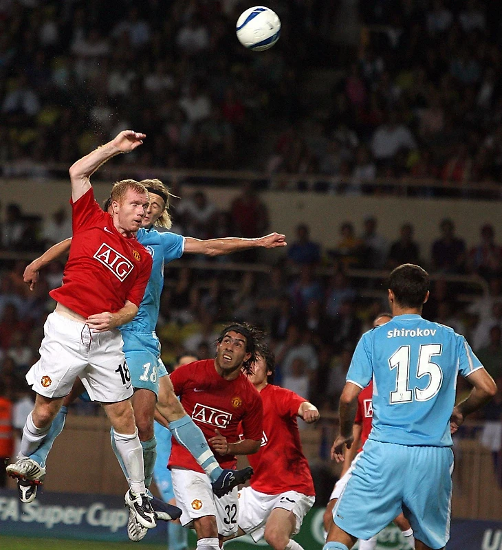 Константин Зырянов сошелся в центре поля с Полом Скоулзом.
