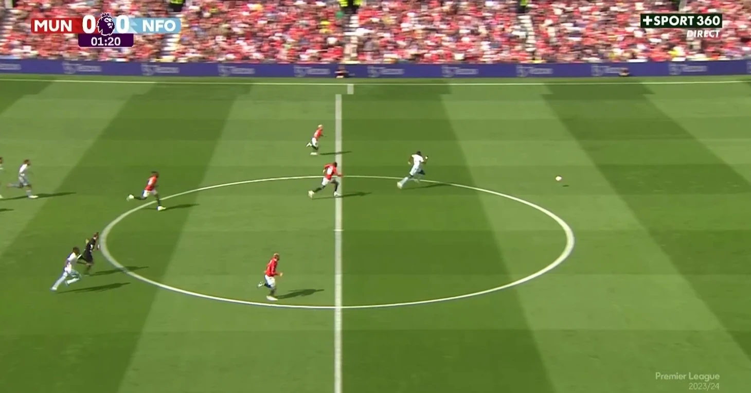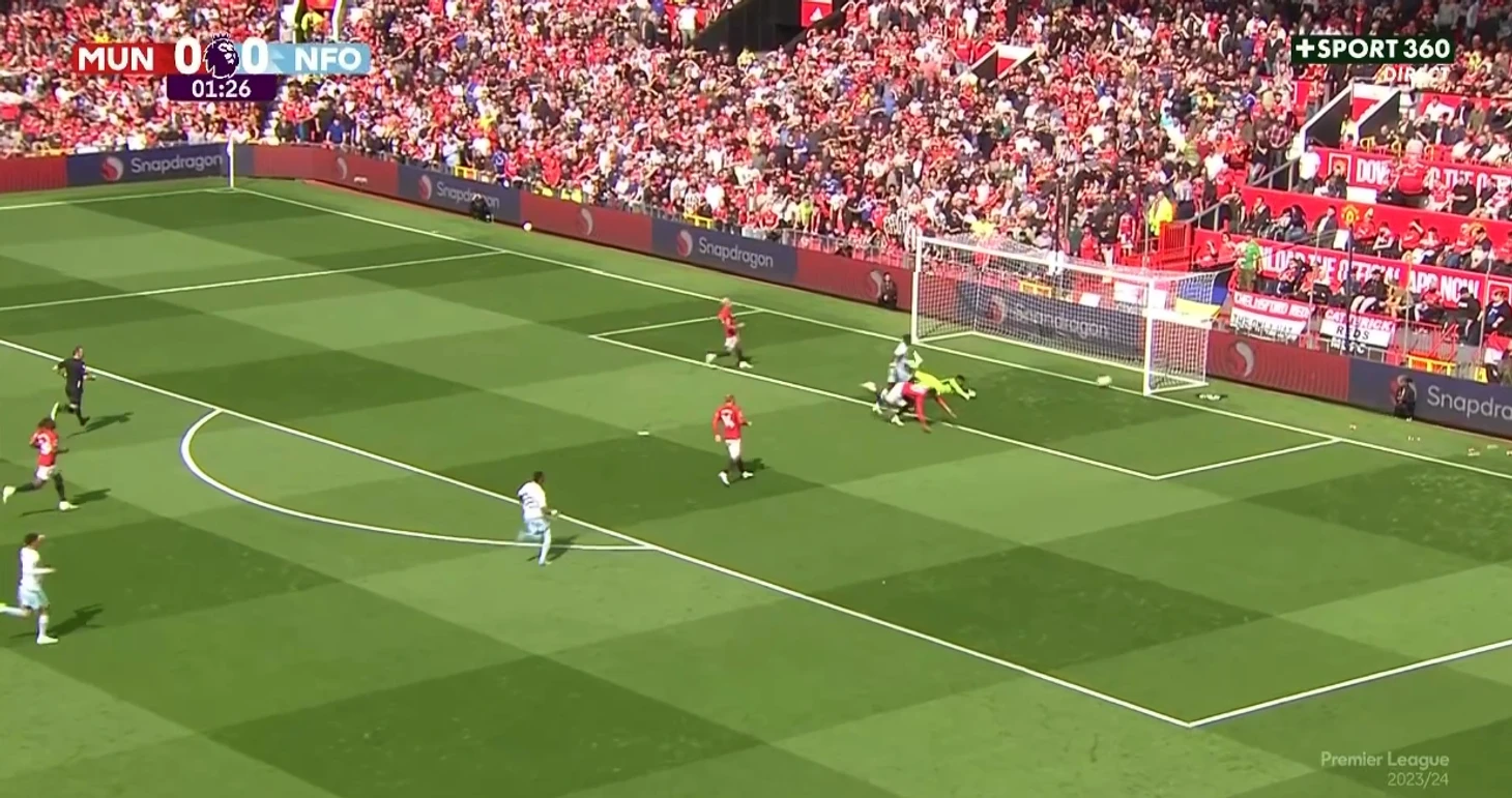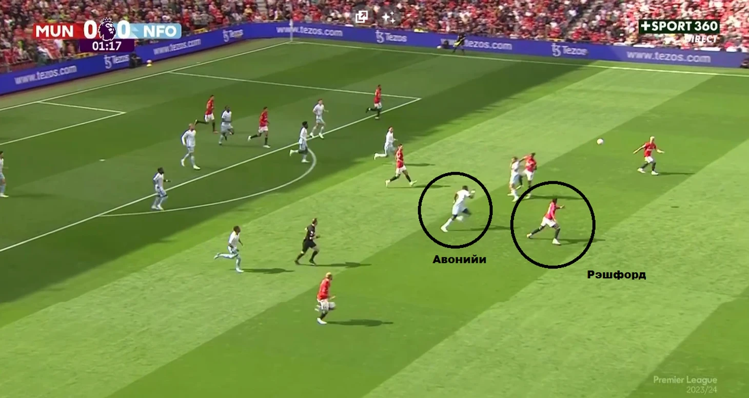 Команда Тен Хага получила право на угловой и подала его настолько плохо, что вынос мяча игроком «Форест» вывел Тайво Авонийи один на один с Андре Онана. Удивительно то, что роль последнего защитника внезапно исполнял... Маркус Рэшфорд.