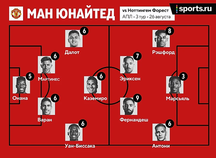 Бруну Фернандеш (9) – лучший игрок матча. Команда отлично исполнила заготовленный стандарт, который завершился ассистом Бруну на второй гол. И как всегда отличная реализация пенальти португальцем. Оставил «Ноттингем» в меньшинстве, когда на нем совершили фол последней надежды.