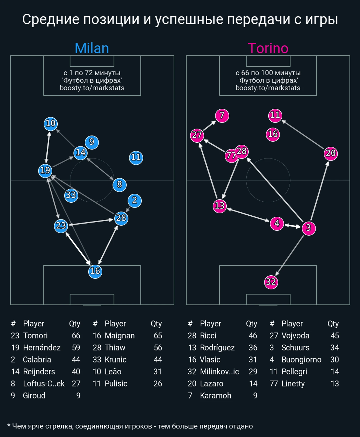 Инфографика ниже – наглядный пример того, как интенсивно туринцы бороздили фланги. Особенно наглядно их средние позиции смотрятся на фоне расположения футболистов хозяев.