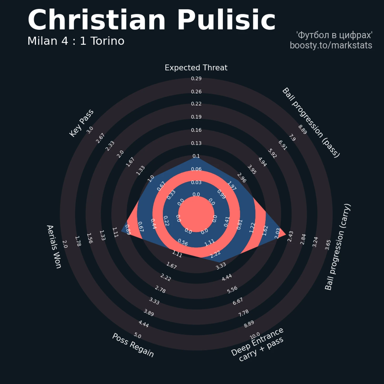 В контексте комбинационных действий «Милана» хочется отметить бывших игроков «Челси». Жиру выдал образцово-показательный матч в игре без мяча: помимо открываний француза, каждый разворот его корпуса помогал партнёрам выбрать более удобную позицию. Лофтус-Чик не оставил шансов бедняге Родригесу: постоянно раскачивал Рикардо, обходил его на скорости за счёт длины ног, а в эпизоде с первым голом и вовсе обманул на замахе как мальчишку. Пулишич – отдельная история. Большую часть игрового времени американец действовал по принципу «не навреди», оставаясь в тени более инициативных партнёров, однако при первой реальной возможности проявить своё голевое чутьё Кристиан оказался в нужное время в нужном месте. Его итоговый многоугольник силы красноречивее всего отображает манеру игры нападающего: успел везде и по чуть-чуть.