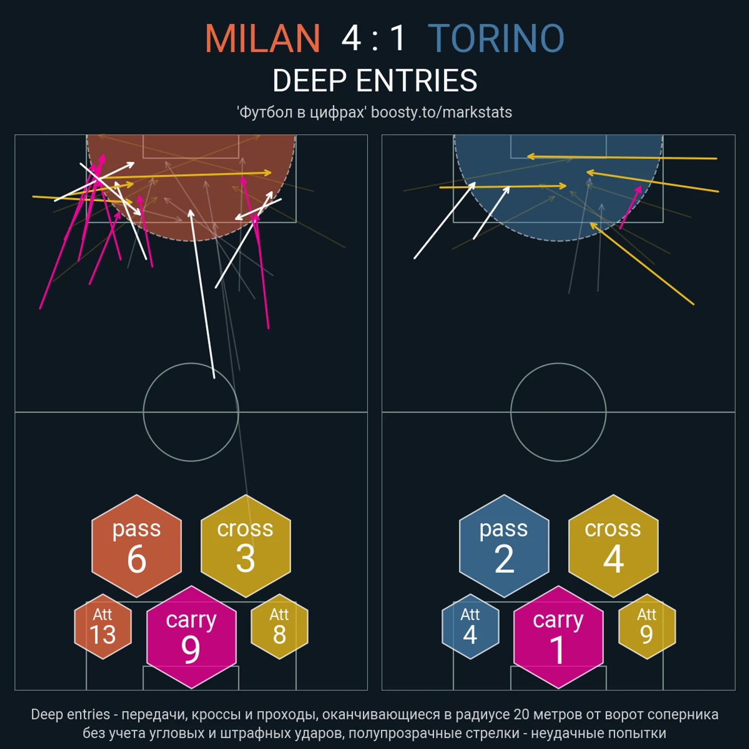Но вернёмся к Deep Progressions «Милана». Здесь показательно даже не то, что хозяева чаще протаскивали мяч в штрафную и реже подавали с флангов, а то, что единственным, кто в принципе делал навесы стал… Леау. Внимательный глаз узрит корень проблемы в Схюрсе, который отыграл неплохой первый тайм как по части персональной опеки и блоков (у португальца из-за него всего 18 (!!!) успешных передач из 32 попыток), так и в чужой штрафной. Что касается самих туринцев, превалирующим средством доставки снаряда в штрафную стали как раз навесы, хотя все эти попытки обрывались в цепких перчатках вратаря «россонери».