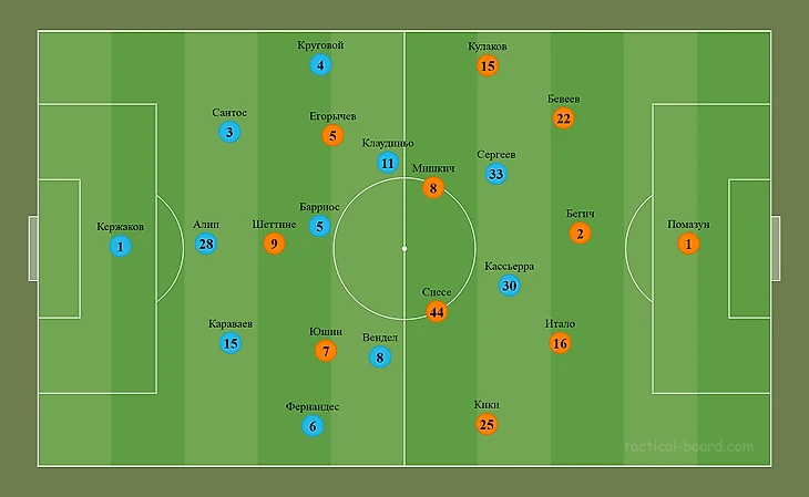 В первых турах Гончаренко подстраивался под соперников и выбирал схему 5-2-3 против тех, кто играет с тройкой ЦЗ (ЦСКА, «Пари НН») и 4-4-2 в матчах с командами, у которых в первой линии при владении находятся только 2 игрока («Оренбург», «Спартак»). Но перед «Зенитом» главный тренер попробовал сразу оба эти варианта в каждом из таймов игры с «Балтикой». Игнашевич использует ту же схему, что и Семак, поэтому это можно было рассматривать как подготовку к игре против чемпиона.