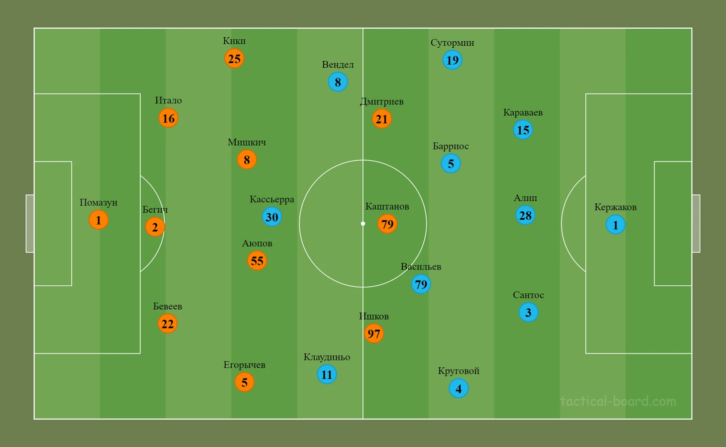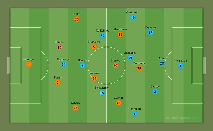 Совсем небольшой отрезок «Зенит» провёл с двумя шестёрками. Васильев и Барриос находились на одной линии при владении. Команда Семака так почти не играет и в этом матче тоже хозяева быстро перестроились ещё раз после очередных замен. В центре появился ромб, в котором Ду Кейрос и Коваленко располагались ближе к флангам, а Вендел находился под Кассьеррой.