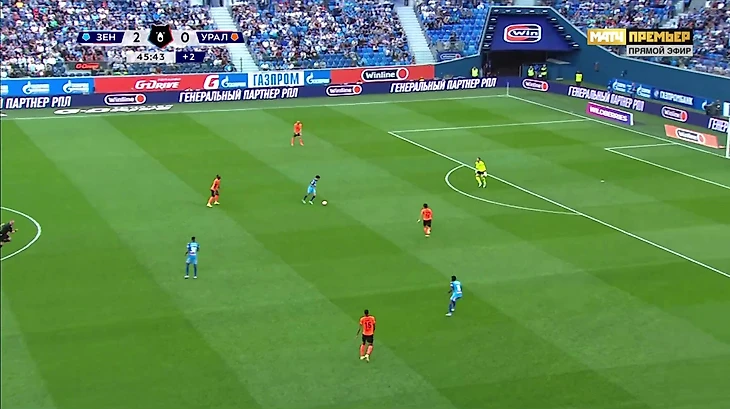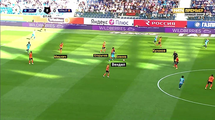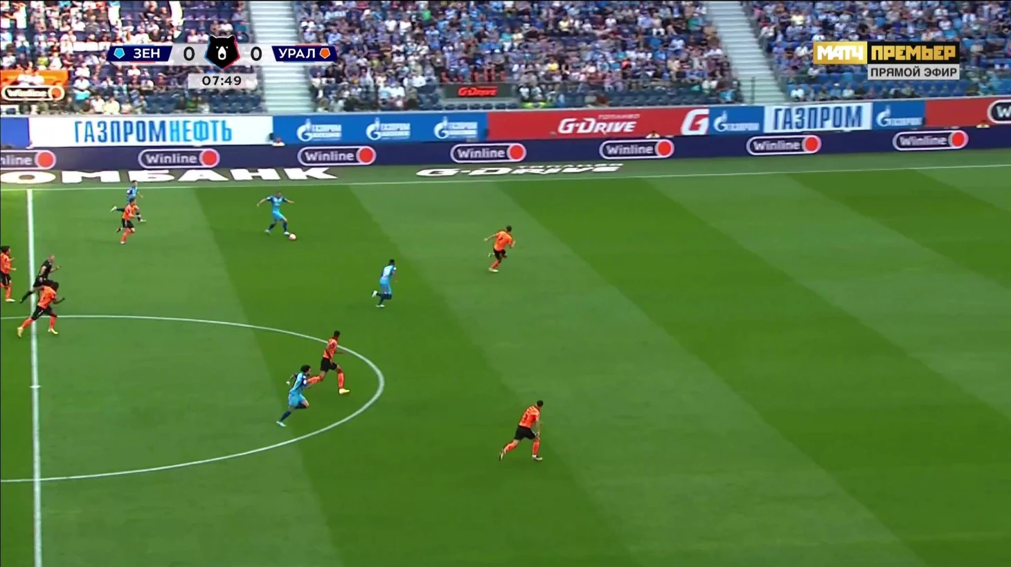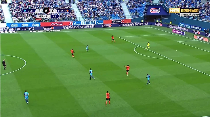 Как только «Зенит» стал оказывать давление персонально, «Урал» начал сыпаться. Огромное количество потерь на своей половине поля. Проходить давление индивидуально (как Вендел) в «Урале» не умеет никто (на таком уровне). В передачах тоже было много брака, под давлением стал ошибаться даже Мишкич. При этом «Урал» раз за разом продолжал попытки коротких розыгрышей и не возвращался к лонгболлам. Даже в простых ситуациях, как перед вторым голом, случались безумные привозы. Но тренерский штаб ничего не менял и решил дождаться перерыва. Главной иллюстрацией беспомощности «Урала» в первом тайме стал третий гол.