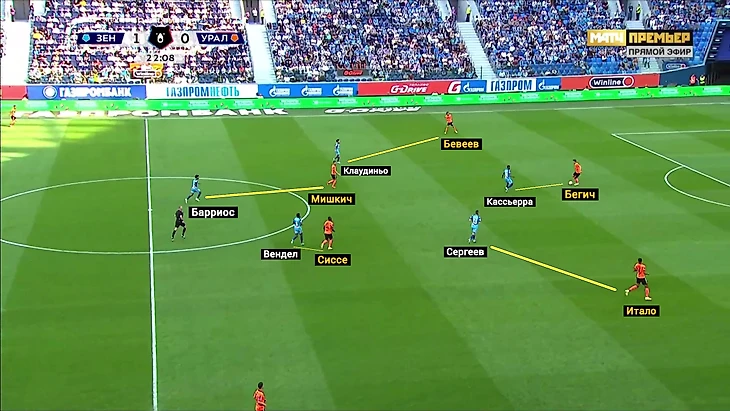 Раньше в центре поля в паре с Мишкичем выходил Аюпов и Даниэль был единственным разыгрывающим опорником. Сейчас вместо Аюпова был Сиссе и теперь при розыгрыше у «Урала» были сразу две шестёрки. Да, в прошлом сезоне Гончаренко всегда играл так, когда Сиссе был здоров. Но в этом сезоне полузащитник впервые появился в старте после травмы и по игре было заметно, что он только набирает форму. Гончаренко отказался от длинных передач в билдапе и игроки должны были разыгрывать мяч коротко. В начале матча проблемы не были так заметны – помогало численное большинство в первой линии. Против трёх центральных защитников «Урала» у «Зенита» были Сергеев и Кассьерра. Но хозяева быстро адаптировались и один из центральных полузащитников стал подниматься выше, чтобы оказывать давление.