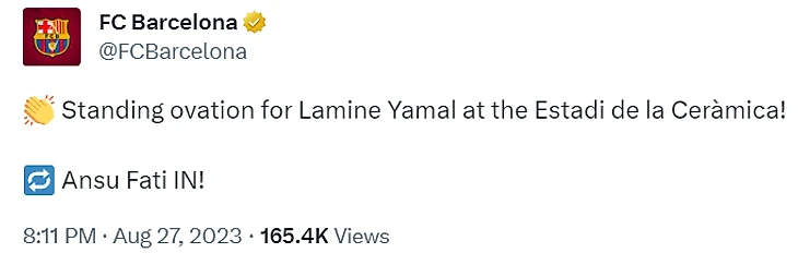 Официальный аккаунт «Барсы» тоже обратил на это внимание: «Стоячие овации для Ламина Ямаля на «Эстадио де ла Серамика».