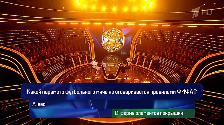 «Конечно же этот элемент, этот параметр, очень важен для мяча. И конечно же, он оговаривается, Владимир. Я сейчас говорю о весе. А ответ D - правильный» - улыбнувшись сказала Юлиана Караулова - ведущая игры