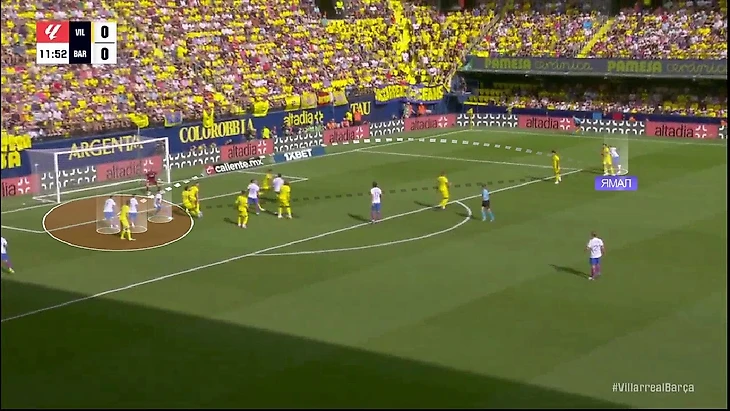 Начнём с первого гола, который пришёл вторым темпом после розыгрыша углового. Да, Ямал сделал классную подачу, но обратите внимание на ситуацию на дальней штанге – там сразу три игрока «Барселоны», которые скорее друг другу мешают, чем им защитники «Вильярреала»: