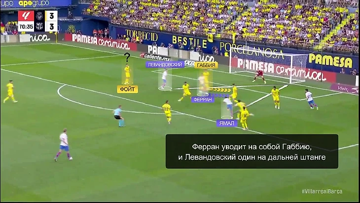 Победный гол «Барселоны» – атака получилась быстрой из-за отсутствия прессинга «Вильярреала» у ворот тер Стегена. Ямал оказался против Педрасы, легко его обыграл, сместился в центр и пробил в штангу. Обратите внимание на Феррана – он в этот момент делает резкий рывок вправо и уводит туда же Габбию. Хуан Фойт просто прозевал этот момент – слева никто не подключился, аргентинец мог сужаться и помешать Левандовскому добить мяч в пустые. А так Роберт остался абсолютно один на дальней штанге: