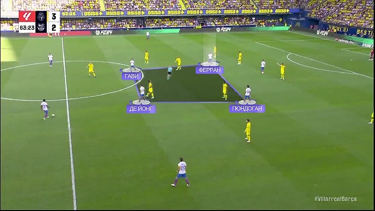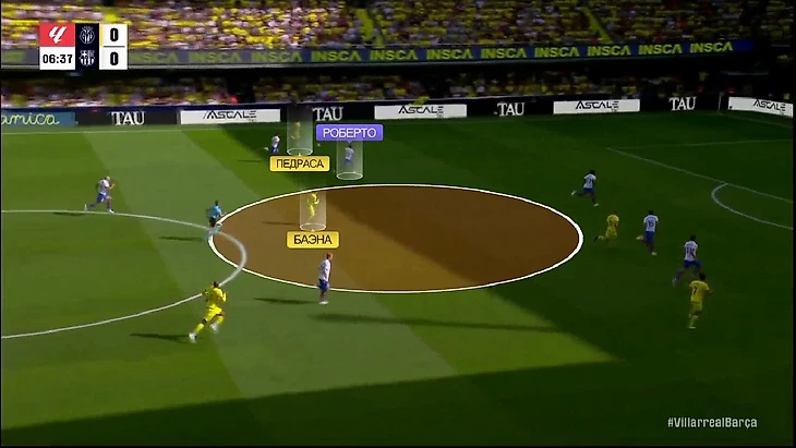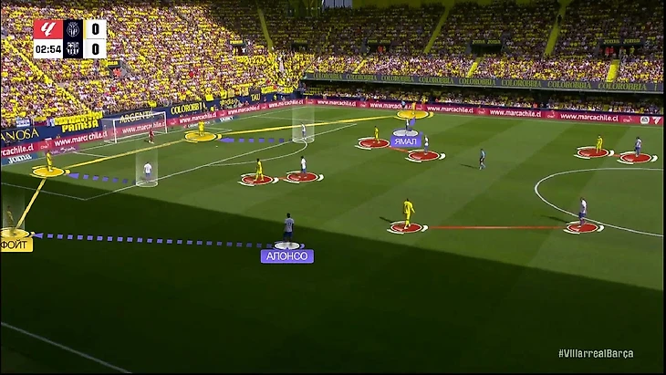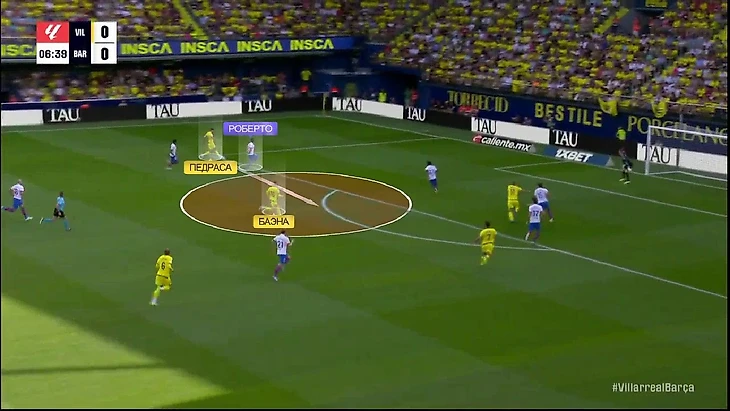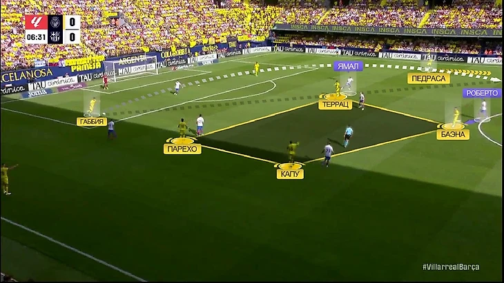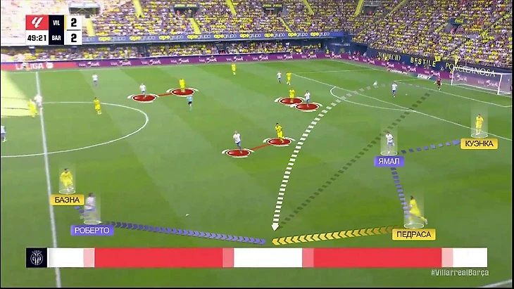 Слабая игра Ямала без мяча, конечно, не единственная причина успешности «Вильярреала» в прохождении прессинга «Барсы». Хозяева регулярно запутывали каталонцев с помощью квадрата в центре поля – то, что любит использовать сама «Барселона». У «Вильярреала» в роли ложного вингера выступал Алекс Баэна. Он регулярно опускался в центр поля и постоянно ставил перед Роберто сложную дилемму – оставить или выдвигаться за своим игроком?