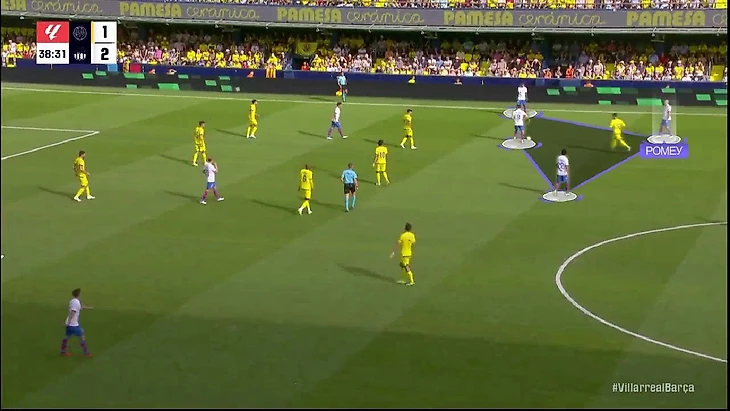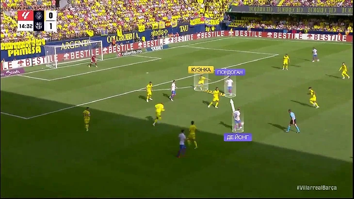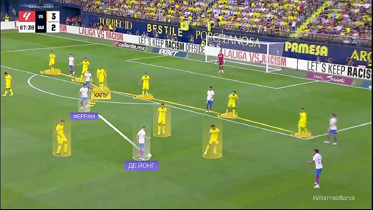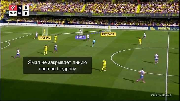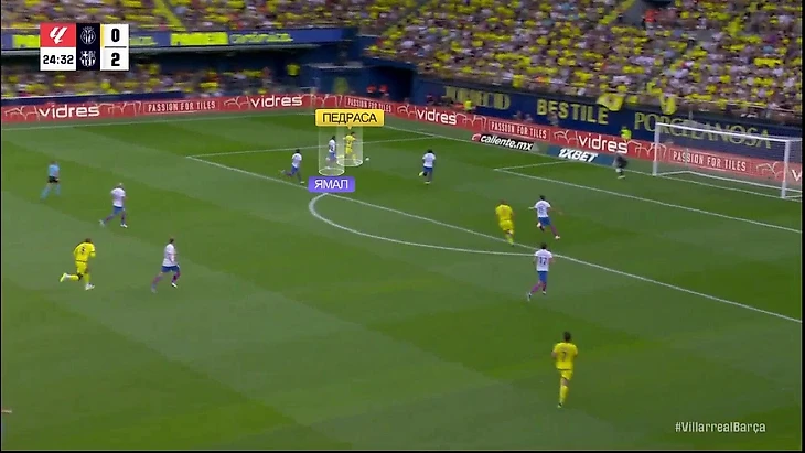 Как это должно работать в теории: в случае, если Йоргенсен точно пасует на Фойта или Педрасу, игроки «Барсы» смещаются и успевают их накрыть. На практике же, Ямалу не удавалось этого делать – он регулярно проигрывал позицию Педрасе, а «Вильярреал» постоянно организовывал атаки через левый фланг. Вот пример – Куэнка получил мяч от вратаря, продвигается с ним вперёд, при этом Ямал вообще не закрывает линию паса на Педрасу: