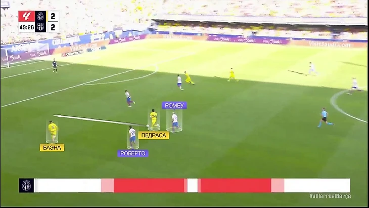Третий гол «Вильярреала» – это как хорошая реализация задумки с квадратом в центре поля, так и проблемы Ямала при игре без мяча. Ситуация: в центре поля все разобраны, а Ямал снова располагается узко. Йоргенсен делает заброс на вновь свободного Педрасу, затем Роберто бросает Баэну (потому что оказался 1-в-2), но ещё и дуэль Педрасе проигрывает и всё становится совсем печально. Ромеу из-за невысокой скорости не успел помочь: