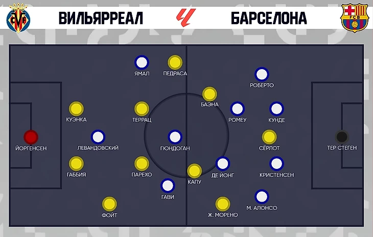У «Барселоны» снова в лазарете Араухо и Педри – уже пора привыкать. Они составили компанию Иньиго Мартинесу, но тот будет готов уже к следующему туру. По-прежнему дисквалифицирован Рафинья. В общем, на старте сезона потерь и так много, так к ним ещё и Бальде добавился – вроде как травма не серьезная, но в матче с «Вильярреалом» он не вышел. Стартовый состав Хави выставил не самый ожидаемый, даже с учётом потерь. В первую очередь это касается Серджи Роберто – центральных защитников всё равно хватало, чтобы не отходить от классики, но Хави решил обратиться к услугам капитана «Барсы» – возможно зря. В остальном, больших сюрпризов не было.
