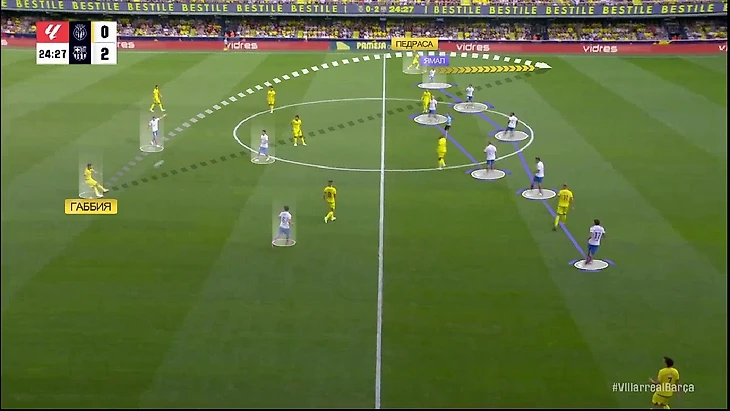 Вот пример такой ситуации – Баэна уходит в центр, за ним выдвигается Роберто, а Ямал снова поздно реагирует на перевод на Педрасу – у того полностью свободный фланг: