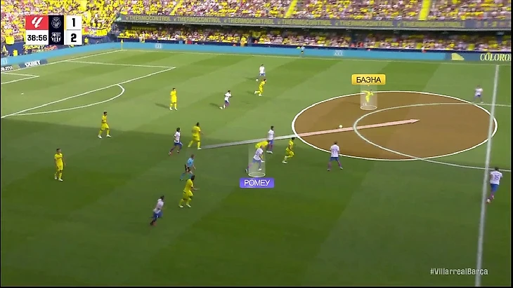 Если в этом голе Ромеу сложно предъявить претензии, то при 2:2 именно его расположение с мячом стало ключевым фактором. О чём идёт речь? Прежде всего о его склонности уходить на фланги. Перед атакой с голом Сёрлота опорник «Барсы» сначала был на правом фланге, перевёл оттуда мяч на левый, а затем сам пришёл на левый фланг, оставив дыру в центре поля: