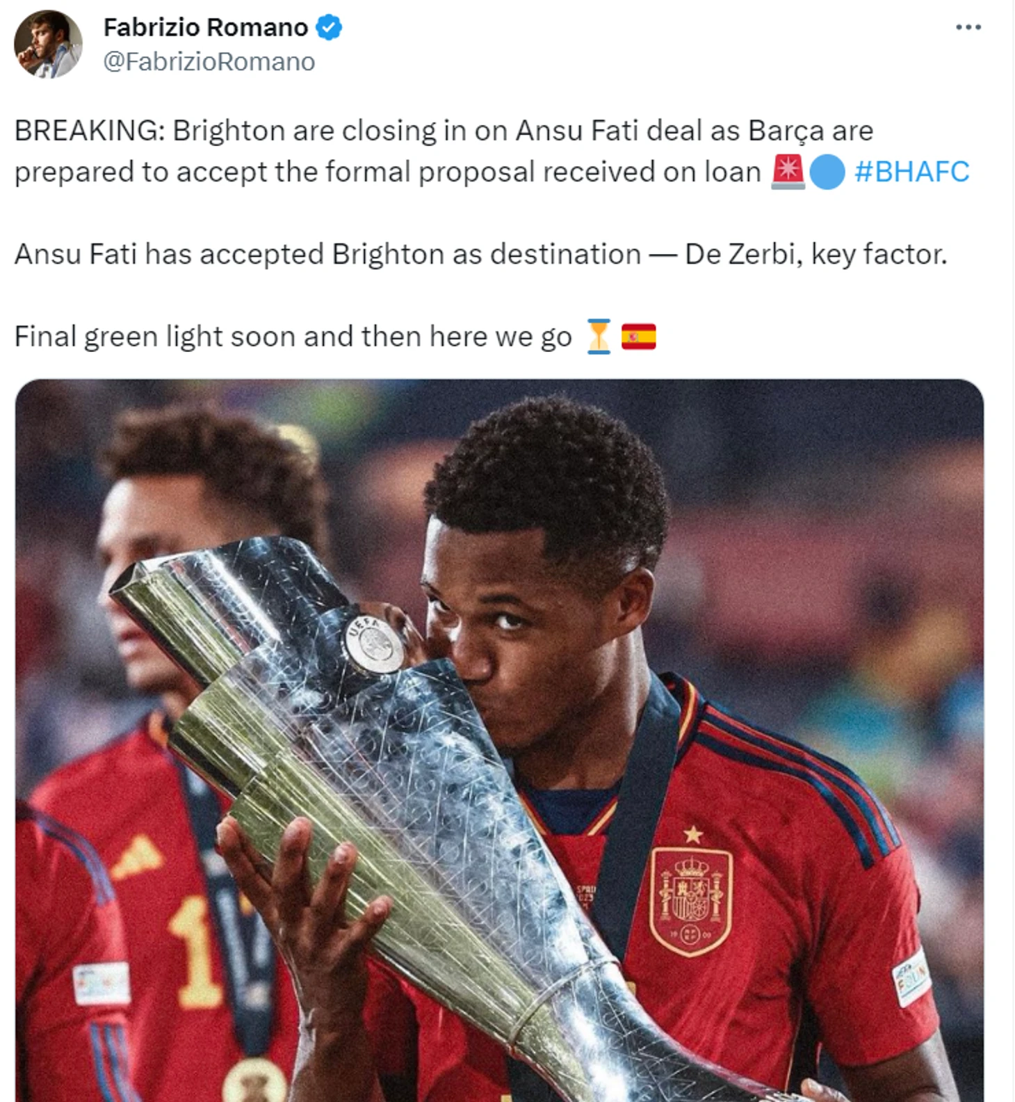 «Срочно: «Брайтон» близок к подписанию Ансу Фати, «Барса» согласилась на формальное предложение об аренде игрока.